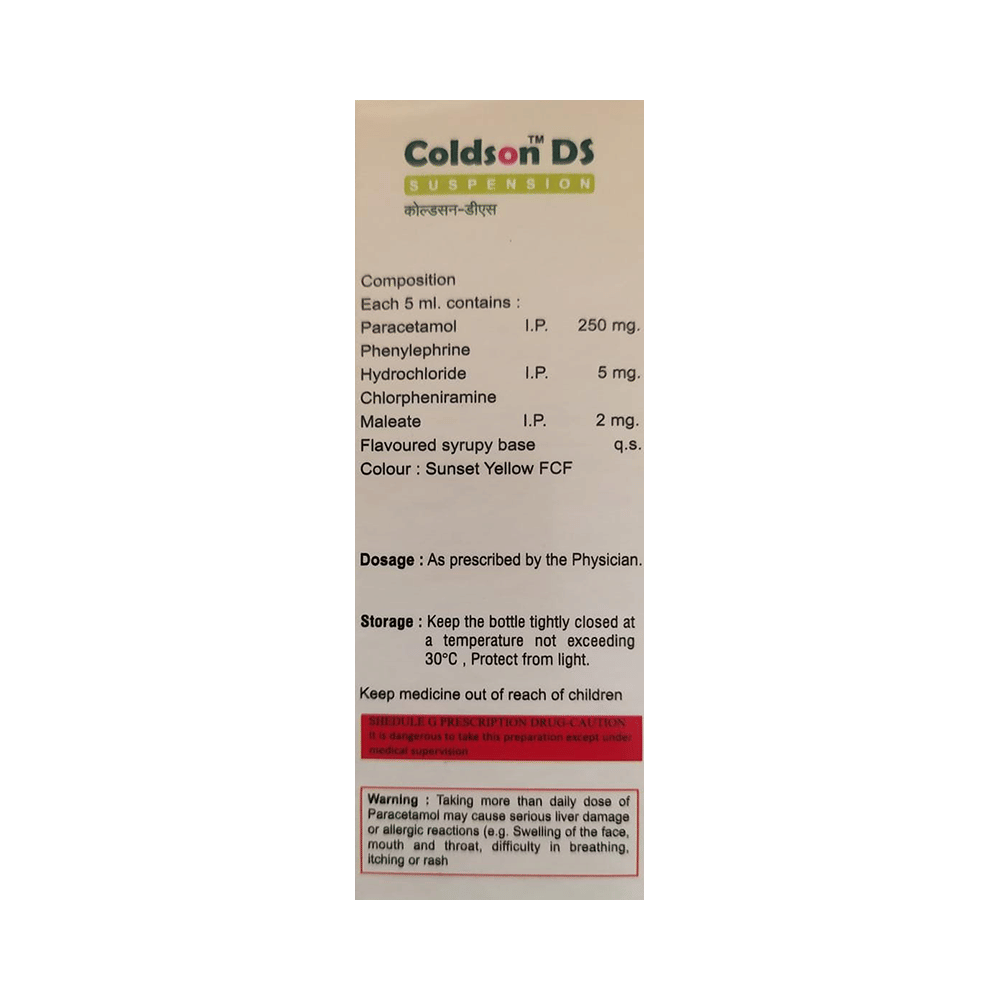 Coldson DS Syrup is a medicine used in the treatment of common cold symptoms. It provides relief from symptoms such as headache, sore throat, runny nose, muscular pain, and fever. Coldson DS Syrup can be taken with or without food. The dose and duration will depend on the severity of your condition. You should keep taking the medicine even if you feel better until the doctor says it is alright to stop using it.Using this medicine may cause a few common side effects such as nausea, vomiting, sleepiness, dizziness, and headache. If any of these side effects do not resolve with time or get worse, you should let your doctor know. Your doctor may be able to suggest ways of preventing or reducing the side effects. In general, you should try to use the smallest amount necessary to control your symptoms.Before using the medicine, you should tell your doctor if you have any other medical conditions or disorders. To make sure it is safe, you should let your doctor know all the other medicines you are taking. Also, tell your doctor if you have any problems with the liver or kidneys. Avoid consumption of alcohol while on treatment with this medicine as it may increase the chance of some side effects. Pregnant and breastfeeding women should consult their doctors first before using the medicine.