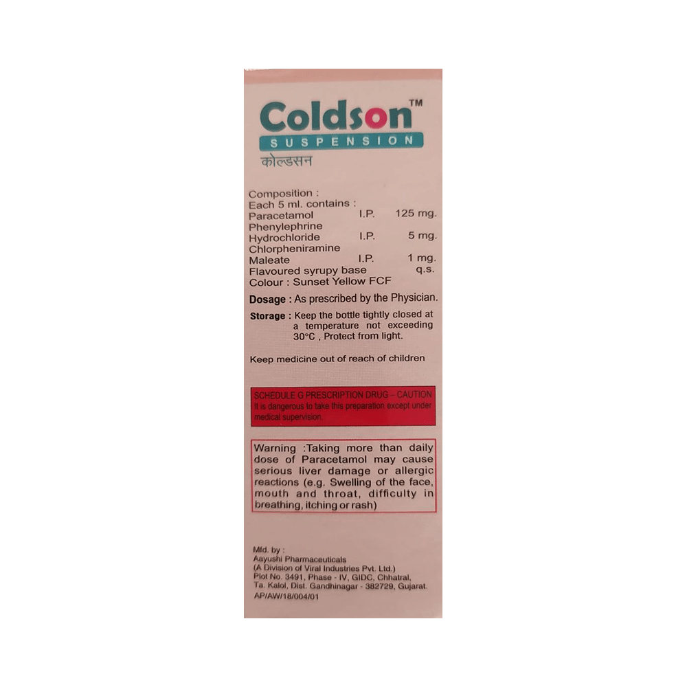 Take this medicine in the dose and duration as advised by your doctor. Check the label for directions before use. Measure it with a measuring cup and take it by mouth. Shake well before use. Coldson Oral Suspension Mango may be taken with or without food, but it is better to take it at a fixed time.
