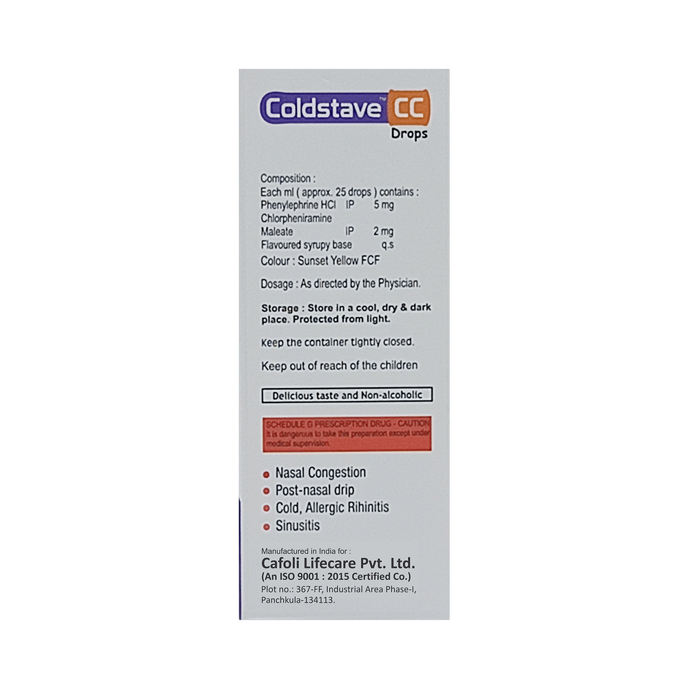 Coldstave CC Oral Drops Orange is a combination medicine used for the symptomatic treatment of common cold in children. It helps relieve discomfort caused by a runny nose, blocked nose, and sneezing, allowing the child to breathe more easily and feel better. Coldstave CC Oral Drops Orange may be given to your child with or without food. Always follow the exact dose and duration prescribed by the doctor. The dosage will depend on your child’s age, weight, and the severity of symptoms. Do not stop the medicine early, even if your child seems to be feeling better, unless advised by the doctor.Common side effects may include nausea, vomiting, or headache. These are usually mild and temporary. However, if you notice anything unusual or are concerned about how your child is responding to the medicine, consult your doctor promptly. This medicine may also cause drowsiness, so avoid engaging your child in activities that require alertness until you know how it affects them.Make sure your child stays well hydrated while taking Coldstave CC Oral Drops Orange. Inform your doctor if your child has any history of liver or kidney problems, as the dose may need to be adjusted accordingly.Note: As per the Ministry of Health and Family Welfare, Coldstave CC Oral Drops Orange should not be used in children below 4 years of age.