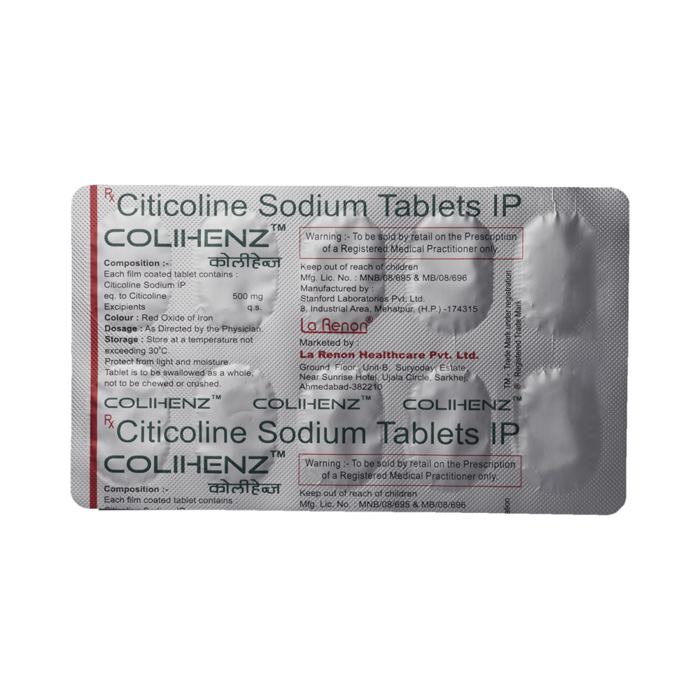 COLIhenz Tablet helps in the treatment of stroke, head injury, Alzheimer's disease, and memory loss (dementia) in Parkinson's disease. It protects the nerve cells in the brain from damage and also helps to repair the damaged nerve cells. COLIhenz Tablet may be taken with or without food. However, it is advised to take it at the same time each day as this helps to maintain a consistent level of medicine in the body. Your dose depends on your age and the condition you are being treated for. Take this medicine in the dose and duration as advised by your doctor. Do not stop taking it suddenly without talking to your doctor as it may worsen your symptoms.Some common side effects that may be seen with this medicine include decreased blood pressure, stomach pain, diarrhea, irregular heart rate, rash, insomnia, occurrence or intensification of numbness of paralyzed extremities. However, these are temporary and usually resolve on their own. Please consult your doctor if these do not subside or bother you.Before taking this medicine, inform your doctor if you ever had any problems with your kidneys or if you have or ever had any seizures (epilepsy or fits). Always let your doctor know about all the medicines that you are taking before you start with your treatment. Inform your doctor if you are pregnant, planning to conceive or breastfeeding, before using this medicine.