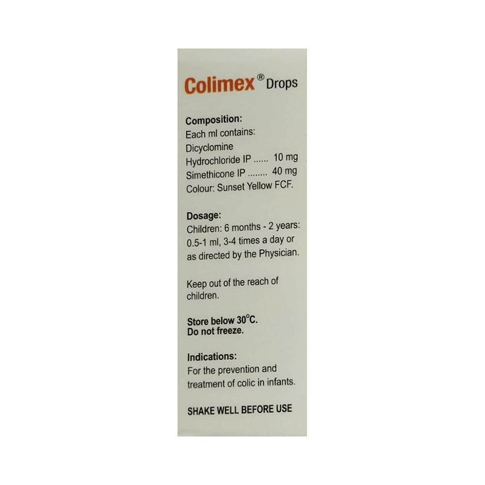 Colimex Oral Drops is commonly given to treat stomach pain, bloating, and abdominal cramps, and pain associated with excessive acidity, gas, infections, and gastrointestinal tract diseases. It also controls symptoms of irritable bowel syndrome. It relaxes the muscles of the gut and absorbs the extra gas. Give the prescribed dose of Colimex Oral Drops to your child orally before a meal or as suggested by the doctor. Your child’s doctor may prescribe this medicine for a few days to many days. But, do not continue it for more than 2 weeks without consulting the doctor as excessive and long-term use may have adverse effects on your child. Additionally, do not abruptly stop the medicine by yourself as it may bring back the symptoms or worsen your child’s condition.Some of the common yet temporary side effects of this medicine include nausea, vomiting, constipation, burping, vision problem, loss of appetite, and drowsiness. These usually subside once your child’s body adapts to the medicine. However, if these side effects persist or become bothersome for your child, do reach out to the doctor on a priority basis.You must let your child’s doctor know about all the medicines your child is being given. Also, inform the doctor of any previous history of allergy, intolerance to any food products, abdominal obstruction, liver impairment, kidney malfunction, or any birth defects, This information is very important for dose alterations and for planning your child’s overall treatment.