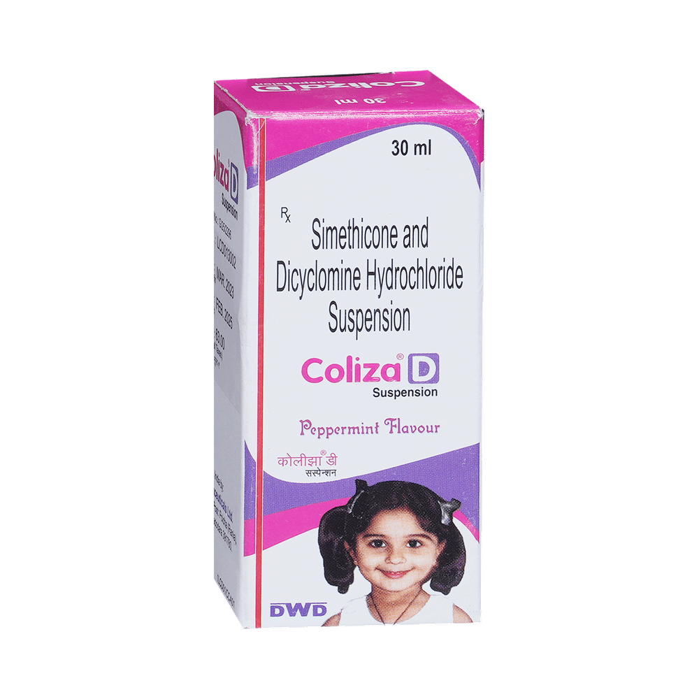 Coliza D Suspension Peppermint is a mixture of two active medicines Dicyclomine, an antispasmodic agent, and Simethicone, an antifoaming medicine. Dicyclomine works by relaxing the muscles in your stomach and gut (intestine). It stops sudden muscle contractions (spasms), thereby relieving abdominal cramps and pain. Whereas, Simethicone disintegrates gas bubbles and allows easy passage of gas.