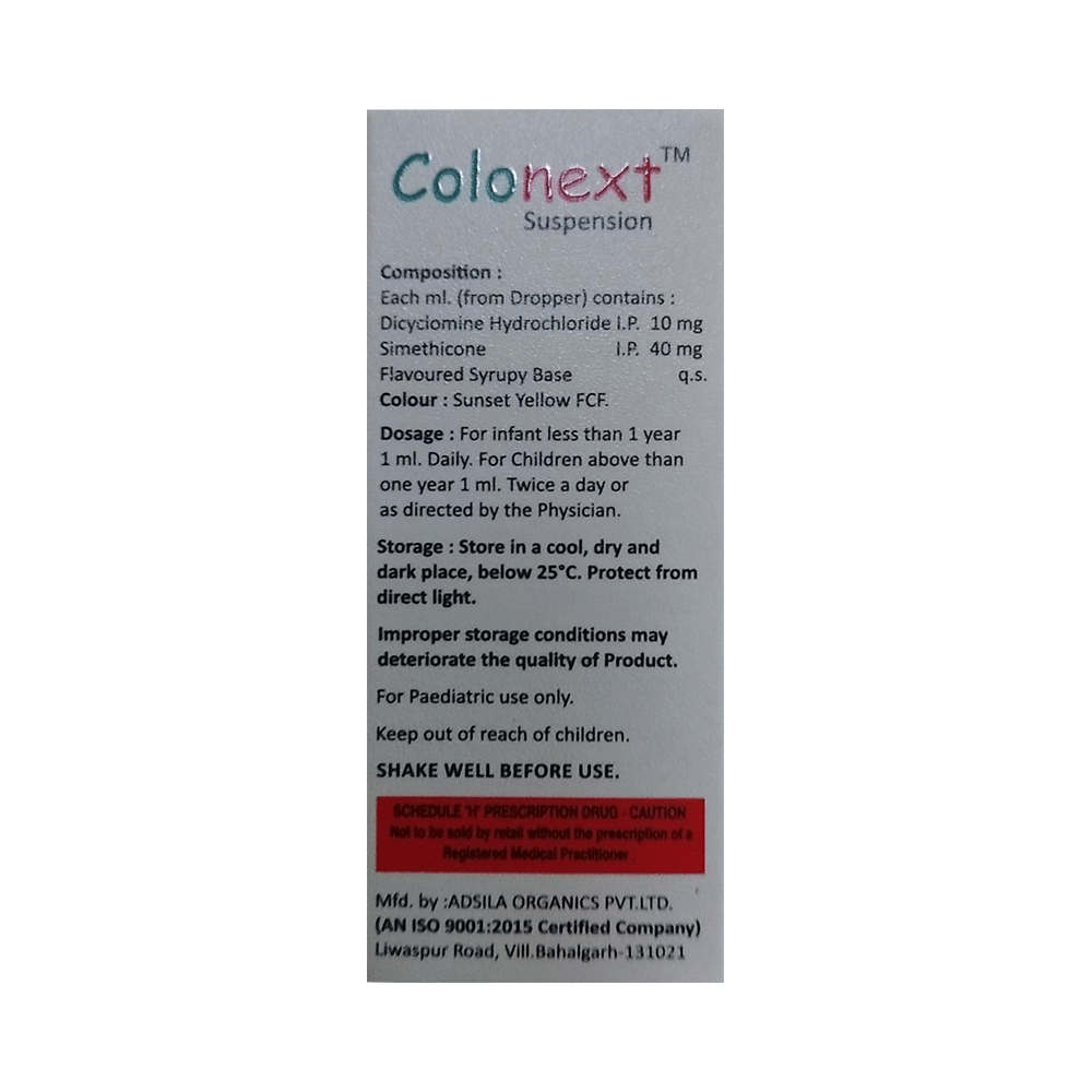 Colonext Oral Suspension is commonly given to treat stomach pain, bloating, and abdominal cramps, and pain associated with excessive acidity, gas, infections, and gastrointestinal tract diseases. It also controls symptoms of irritable bowel syndrome. It relaxes the muscles of the gut and absorbs the extra gas. Give the prescribed dose of Colonext Oral Suspension to your child orally before a meal or as suggested by the doctor. Your child’s doctor may prescribe this medicine for a few days to many days. But, do not continue it for more than 2 weeks without consulting the doctor as excessive and long-term use may have adverse effects on your child. Additionally, do not abruptly stop the medicine by yourself as it may bring back the symptoms or worsen your child’s condition.Some of the common yet temporary side effects of this medicine include nausea, vomiting, constipation, burping, vision problem, loss of appetite, and drowsiness. These usually subside once your child’s body adapts to the medicine. However, if these side effects persist or become bothersome for your child, do reach out to the doctor on a priority basis.You must let your child’s doctor know about all the medicines your child is being given. Also, inform the doctor of any previous history of allergy, intolerance to any food products, abdominal obstruction, liver impairment, kidney malfunction, or any birth defects, This information is very important for dose alterations and for planning your child’s overall treatment.