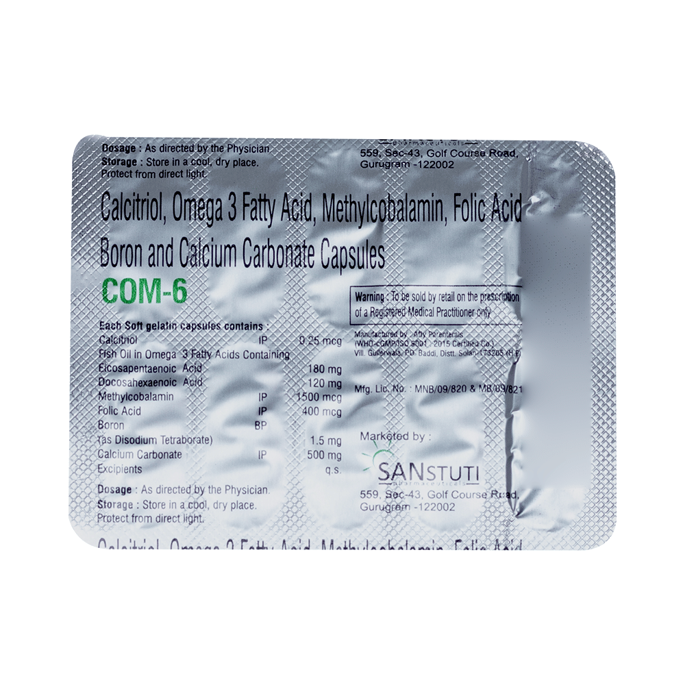 Com 6 Capsule is a combination medicine used in the treatment of nutritional deficiencies such as low blood calcium levels. It helps in the proper growth and development of cells and brain It also promote healthy bones, muscles, nervous system, and heart. Com 6 Capsule can be taken with or without food. It is advised to consume plenty of water with this medicine to avoid dehydration. It should be used in the dose and duration as prescribed by your doctor. It is advised to take this medicine at a fixed time. This medicine should not be taken in more than the recommended dose.This is usually a safe medicine with very minimal side effects. Some common side effects include nausea, diarrhea, constipation, fatigue, and pain in upper abdomen. Contact your doctor immediately if you notice any symptoms of allergic reactions like swelling, itching, difficulty in breathing, hives, etc.Before taking this medicine, tell your doctor if you have any other health conditions like kidney diseases as dose adjustment may be required. Inform your doctor if you are taking any other medicines or if you are pregnant or breastfeeding. It is advised not to consume alcohol after taking this medicine.
