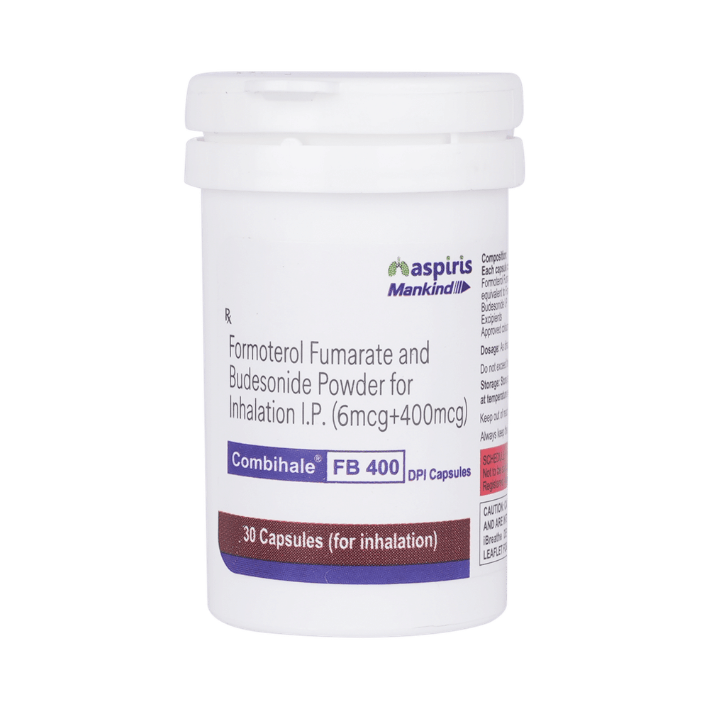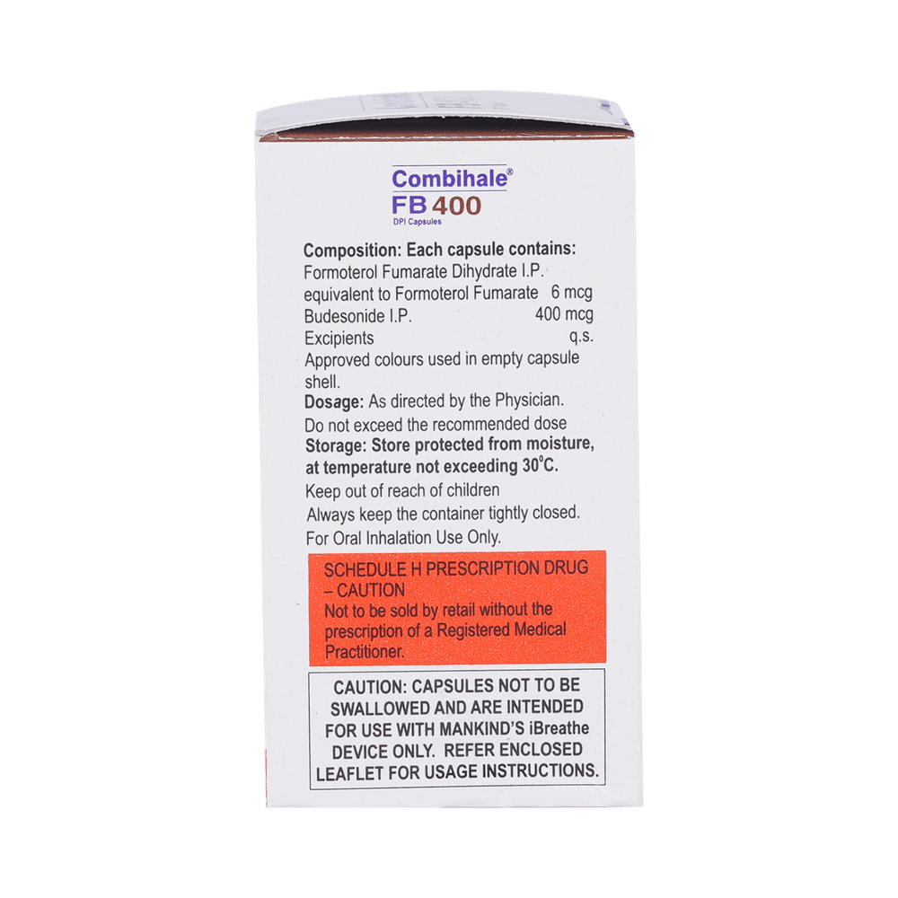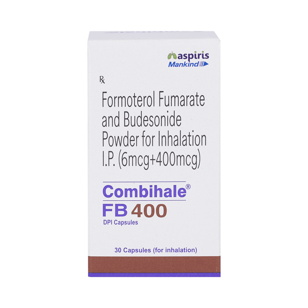 Combihale FB 400 DPI Capsule is a combination of two medicines in one inhaler. It relieves the long-term symptoms of asthma and COPD, making breathing easier. It works by inhibiting the release of certain chemical messengers that cause inflammation (swelling) and relaxes the muscles in the airways. Your doctor will tell you how often you need to use your inhaler. The effect of this medicine may be noticeable after a few days but will only reach its maximum after a few weeks. This medicine must be used regularly to be effective, so go on taking it even if you don't have any symptoms. That means it’s doing its job. If you stop taking it your symptoms may get worse. This medicine should not be used to relieve sudden shortness of breath. If sudden shortness of breath occurs, use your rescue inhaler. To get the benefit from this medicine you need to make sure you get your inhaler technique right, otherwise, it does not work as well.The most common side effects include headache, nausea, vomiting, stomach discomfort, and respiratory tract infection. If you get there, don’t stop taking it but do talk to your doctor. You can prevent some of these symptoms by rinsing your mouth and throat with water or brushing your teeth after using your inhaler. There are other, rarer side effects which can be serious. Talk to your doctor if you're worried about them.Before taking it, you should tell your doctor if you have any kidney or liver diseases so that your doctor can prescribe a suitable dose for you. You should also tell your doctor if you are pregnant, planning pregnancy or breastfeeding.