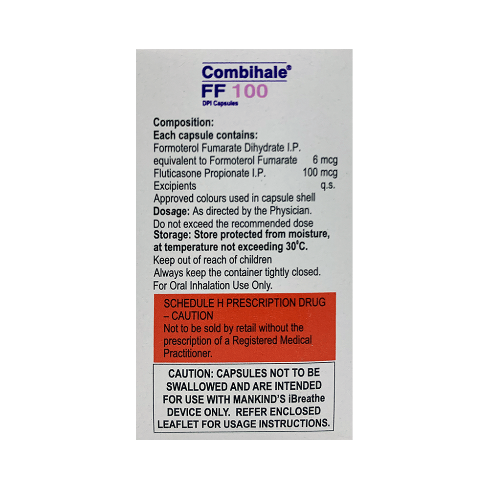 Combihale FF 100 Redicaps is used in the treatment of asthma (wheezing and shortness of breath) and chronic obstructive pulmonary disorder (a lung disorder in which the flow of air to the lungs is blocked). It relaxes the muscles of the air passages and making it easier to breathe. Your doctor will tell you how often you need to use your inhaler. It’s important that you take the lowest dose needed to effectively control your asthma. The effect of this medicine may be noticeable after a few days but will only reach its maximum after a few weeks. This medicine must be used regularly to be effective, so go on taking it even if you don't have any symptoms. That means it’s doing its job. If you stop taking it your asthma and COPD may get worse. It should not be used to relieve sudden asthma attacks. If an asthma attack occurs, use your quick-relief inhaler (reliever). To get the benefit from this medicine you need to make sure you get your inhaler technique right, otherwise, it Does not work as well.The most common side effects are nausea, vomiting, respiratory tract infection, headache, hoarseness of voice, sore throat, cough, musculoskeletal (bone, muscle or joint) pain, and increased heart rate. If you get there, don’t stop taking it but do talk to your doctor. You can help prevent some of these symptoms by rinsing your mouth and throat with water or brushing your teeth after using your inhaler. There are other, rarer side effects which can be serious. Talk to your doctor if you're worried about them. In general, you should be trying to avoid situations that make your asthma worse (your triggers) and try not to smoke.Ask your doctor whether it’s safe to take this medicine if you're pregnant or breastfeeding. Before taking it, you should tell your doctor if you have any kidney or liver diseases so that your doctor can prescribe a suitable dose for you.