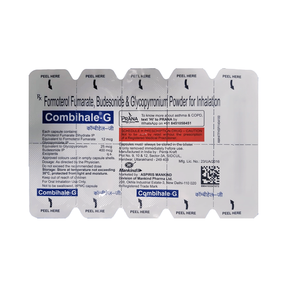 Combihale-G Capsule is a combination of three medicines. It is used in the treatment of chronic obstructive pulmonary disease (COPD). It works in various ways and reduces the symptoms of the disease such as coughing, chest tightness, and shortness of breath. Combihale-G Capsule should be used in the dose and duration as prescribed by your doctor. Use it regularly and as long as your doctor has prescribed it to get maximum benefits from the medicine. Don’t stop using the medicine even if you feel better unless your doctor tells you to. If you stop, your breathing problems could get worse.Combihale-G Capsule is generally safe and effective but some common side effects include dizziness, headache, vomiting, and stuffy nose (nasal congestion). These side effects are usually mild and should gradually improve as your body gets used to this medicine. Let your doctor know if you are bothered by any of this, or if you experience any other side effects which you think are caused by the medicine.Before using Combihale-G Capsule, let your doctor know if you have any preexisting medical conditions. Let your doctor also know all the other medicines you are taking. Additionally, to make sure it is safe for you, tell your doctor if you are pregnant or breastfeeding before taking this medicine. You shouldn’t smoke while on treatment with this medicine. Smoking causes damage to your lungs and will make your condition worse.
