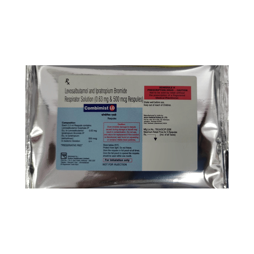 Combimist LD (2.5ml Each) Respules is used for the treatment of chronic obstructive pulmonary disorder (a lung disorder in which the flow of air to the lungs is blocked). It helps in relaxing the muscles of the air passages and making it easier to breathe. It relieves coughing, wheezing and feeling short of breath. Your doctor will tell you how often you need to use your inhaler. The effect of this medicine may be noticeable after a few days but will only reach its maximum after a few weeks. This medicine must be used regularly to be effective, so go on taking it even if you don't have any symptoms. That means it’s doing its job. If you stop taking it your COPD may get worse. This medicine should not be used to relieve sudden shortness of breath. If sudden shortness of breath occurs, use your rescue inhaler. To get the benefit from this medicine you need to make sure you get your inhaler technique right, otherwise, it Does not work as well.The most common side effects are dryness in mouth, shortness of breath, cough, tremor, headache, palpitations, and muscle cramp. If you get there, don’t stop taking it but do talk to your doctor. You can prevent some of these symptoms by rinsing your mouth and throat with water or brushing your teeth after using your inhaler. There are other, rarer side effects which can be serious. Talk to your doctor if you're worried about them.Before taking it, you should tell your doctor if you have any kidney or liver diseases so that your doctor can prescribe a suitable dose for you. Also tell your doctor if you are pregnant, planning pregnancy or breastfeeding.