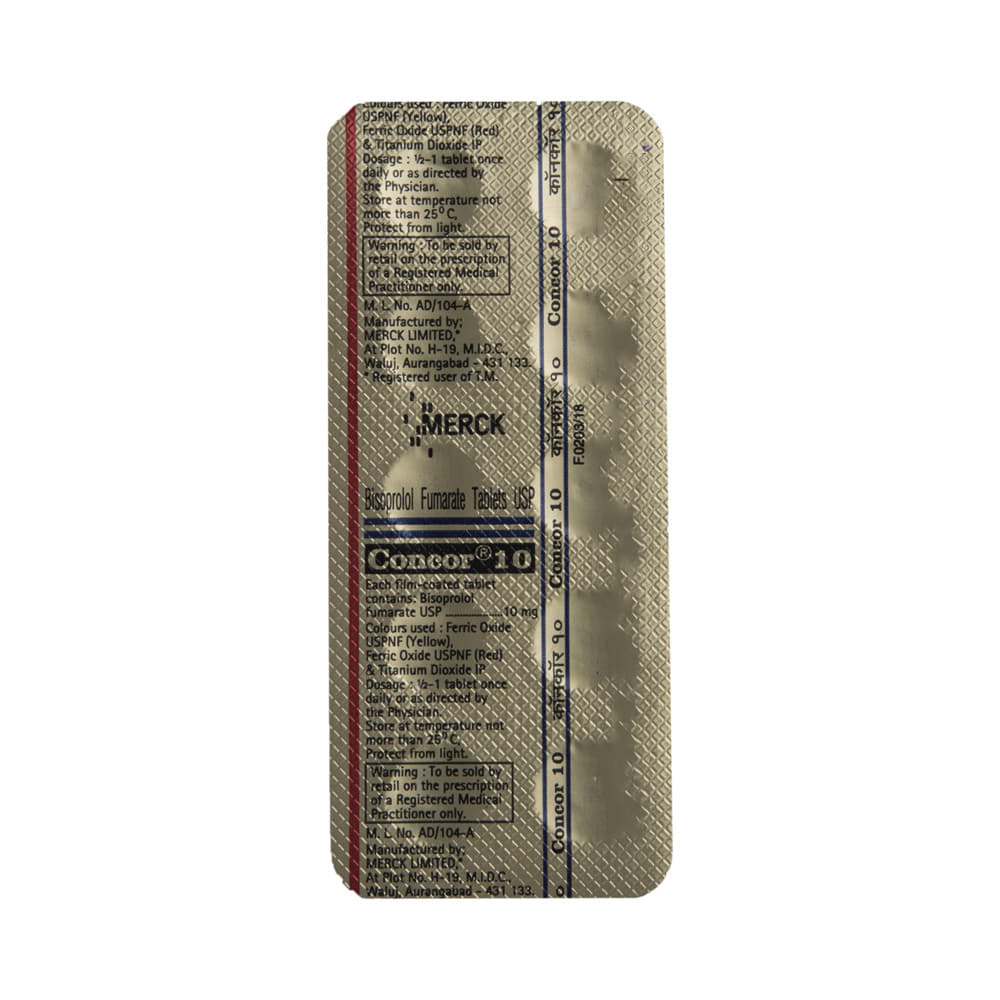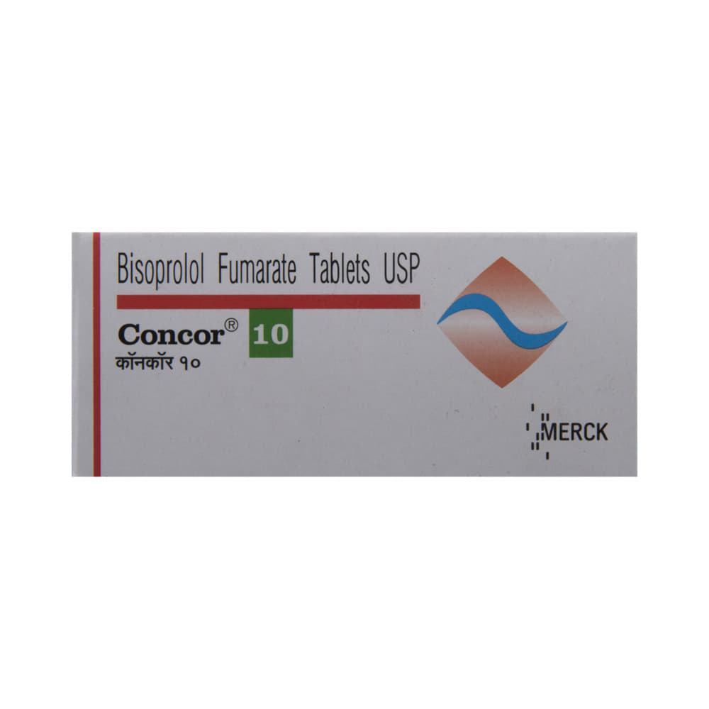 In Treatment of Hypertension (high blood pressure)CONcor 10 Tablet blocks the effects of some chemicals on your heart and blood vessels. It slows down your heart rate and helps the heart to beat with less force. This lowers your blood pressure and helps in reducing your risk of having a stroke, a heart attack, other heart problems, or kidney problems in the future. This medicine needs to be taken regularly to be effective, so keep taking it even if you feel well. Do not stop without talking to your doctor.In Treatment of Angina (heart-related chest pain)CONcor 10 Tablet relaxes the blood vessels so that blood can flow more easily around your body and makes sure that your heart is getting a good supply of oxygen. This makes it less likely that you will suffer chest pain caused by angina. This medicine can help increase your ability to exercise and go about your daily life more easily by reducing the frequency of angina attacks. You should take it regularly and as long as it is prescribed for it to work effectively.In Treatment of ArrhythmiaCONcor 10 Tablet is used to stabilize heart rhythms (particularly atrial fibrillation). It helps in normalizing an abnormal heart rhythm, preventing it from occurring in the first place, or slowing down the heart rate during an episode.In Prevention of Heart attackCONcor 10 Tablet helps lower your blood pressure and make it easier for your heart to pump blood around your body. This reduces the chances of you having a heart attack. It can also reduce the risk of dying if it is given immediately after a heart attack. This medicine needs to be taken regularly to be effective, so keep taking it even if you feel well. Do not stop without talking to your doctor.show moreshow less