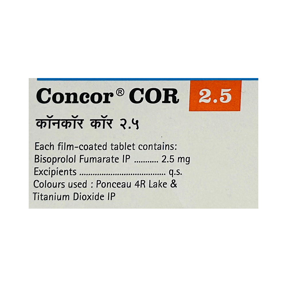 In Treatment of Hypertension (high blood pressure)Concor COR 2.5 Tablet blocks the effects of some chemicals on your heart and blood vessels. It slows down your heart rate and helps the heart to beat with less force. This lowers your blood pressure and helps in reducing your risk of having a stroke, a heart attack, other heart problems, or kidney problems in the future. This medicine needs to be taken regularly to be effective, so keep taking it even if you feel well. Do not stop without talking to your doctor.In Treatment of Angina (heart-related chest pain)Concor COR 2.5 Tablet relaxes the blood vessels so that blood can flow more easily around your body and makes sure that your heart is getting a good supply of oxygen. This makes it less likely that you will suffer chest pain caused by angina. This medicine can help increase your ability to exercise and go about your daily life more easily by reducing the frequency of angina attacks. You should take it regularly and as long as it is prescribed for it to work effectively.In Treatment of ArrhythmiaConcor COR 2.5 Tablet is used to stabilize heart rhythms (particularly atrial fibrillation). It helps in normalizing an abnormal heart rhythm, preventing it from occurring in the first place, or slowing down the heart rate during an episode.In Prevention of Heart attackConcor COR 2.5 Tablet helps lower your blood pressure and make it easier for your heart to pump blood around your body. This reduces the chances of you having a heart attack. It can also reduce the risk of dying if it is given immediately after a heart attack. This medicine needs to be taken regularly to be effective, so keep taking it even if you feel well. Do not stop without talking to your doctor.show moreshow less