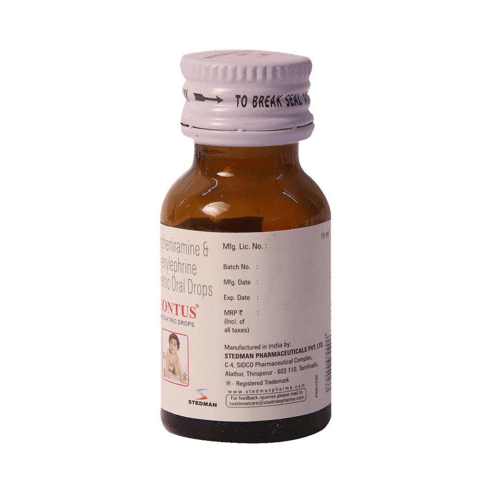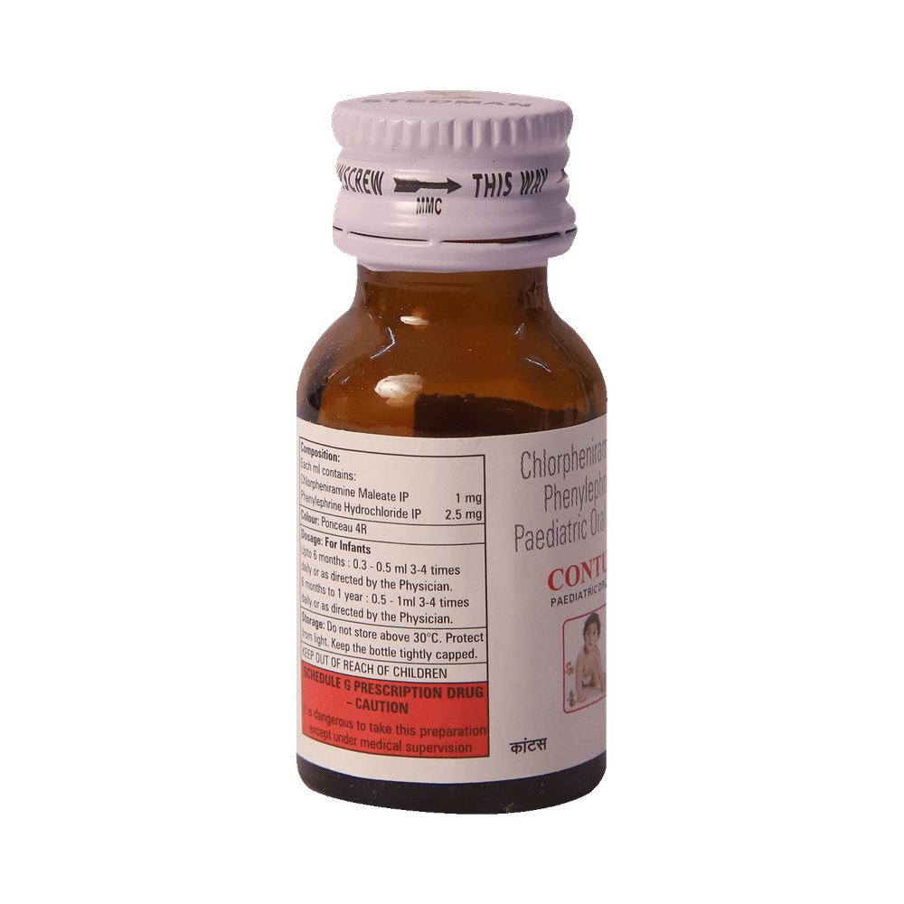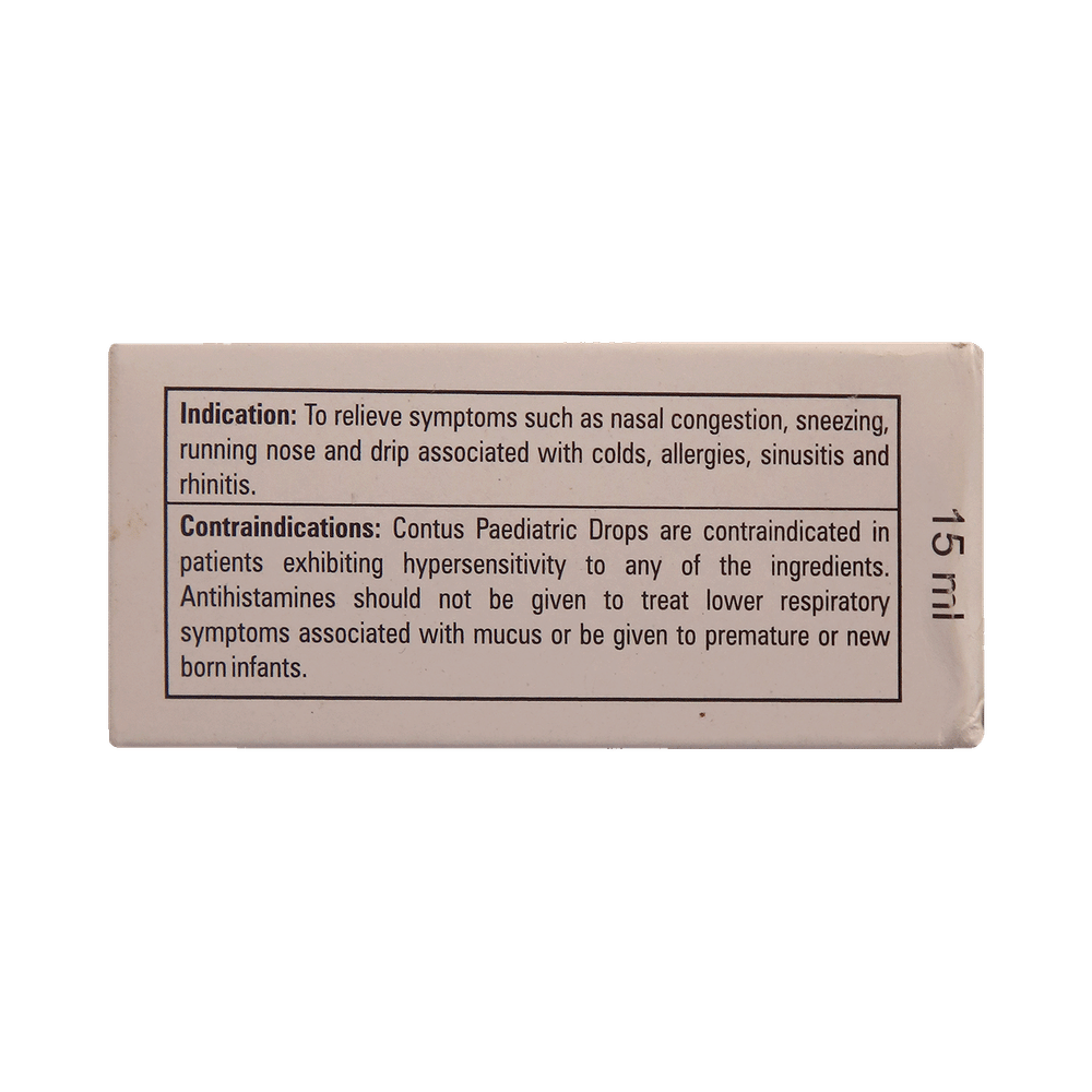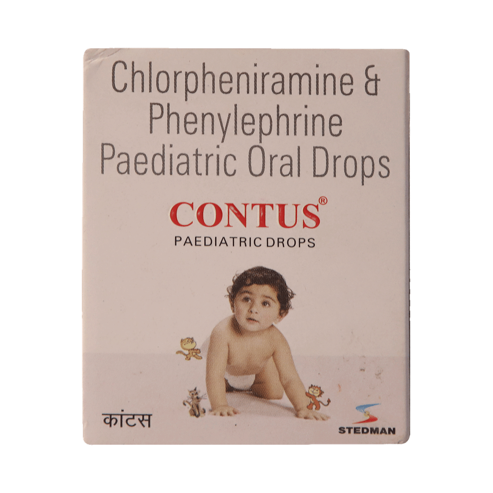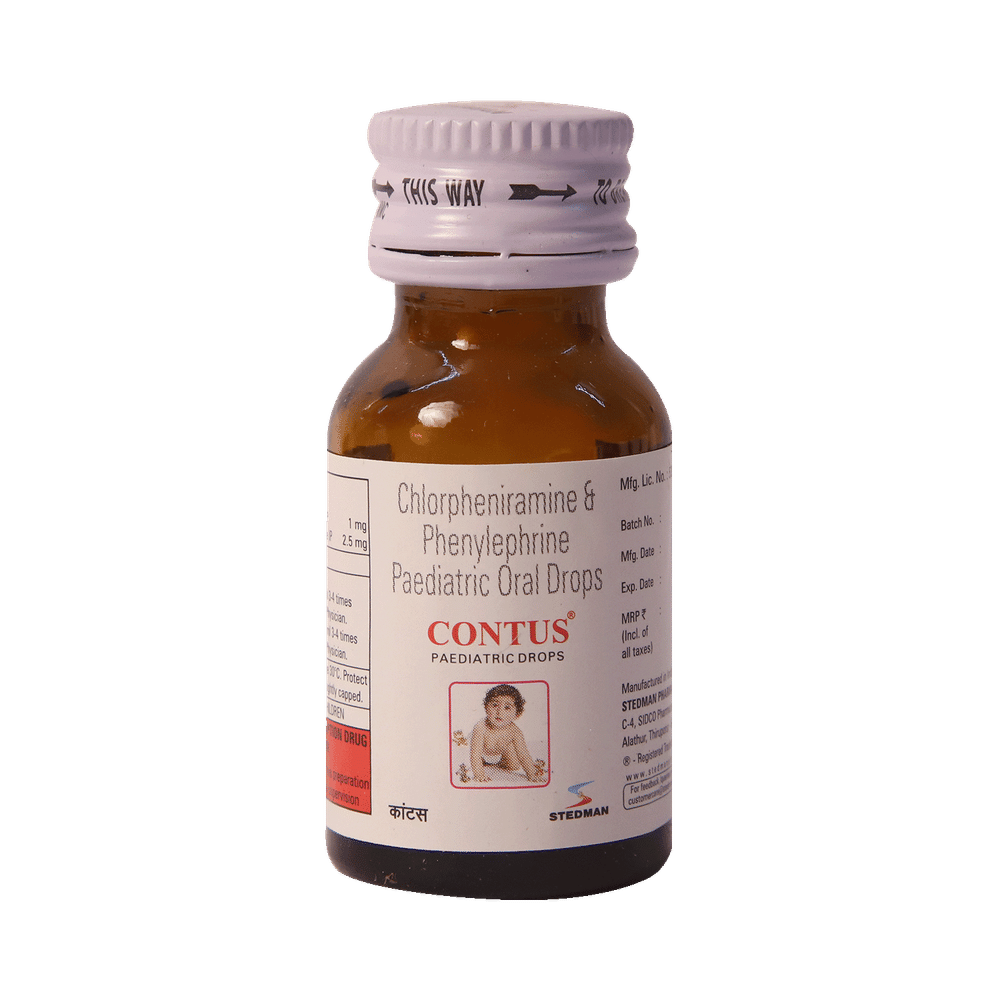Contus Paediatric Oral Drops is a combination medicine used for the symptomatic treatment of common cold in children. It helps relieve discomfort caused by a runny nose, blocked nose, and sneezing, allowing the child to breathe more easily and feel better. Contus Paediatric Oral Drops may be given to your child with or without food. Always follow the exact dose and duration prescribed by the doctor. The dosage will depend on your child’s age, weight, and the severity of symptoms. Do not stop the medicine early, even if your child seems to be feeling better, unless advised by the doctor.Common side effects may include nausea, vomiting, or headache. These are usually mild and temporary. However, if you notice anything unusual or are concerned about how your child is responding to the medicine, consult your doctor promptly. This medicine may also cause drowsiness, so avoid engaging your child in activities that require alertness until you know how it affects them.Make sure your child stays well hydrated while taking Contus Paediatric Oral Drops. Inform your doctor if your child has any history of liver or kidney problems, as the dose may need to be adjusted accordingly.Note: As per the Ministry of Health and Family Welfare, Contus Paediatric Oral Drops should not be used in children below 4 years of age.