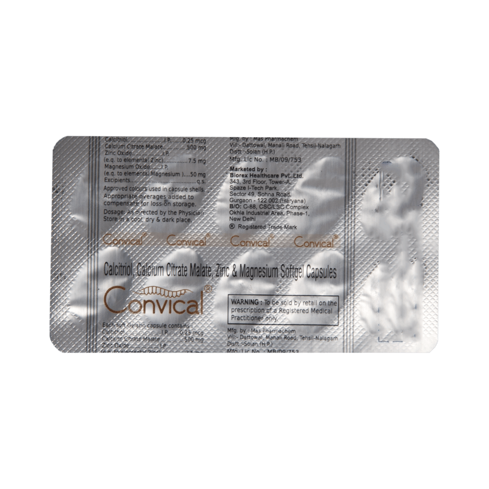 Convical Capsule is a combination of vitamins and minerals. Calcitriol works by helping the body utilize more of the calcium present in ingested foods or supplements and regulating the body's production of parathyroid hormone. Calcium citrate prevents or treats negative calcium balance. Magnesium oxide is a mineral supplement essential for bone mineralization and the formation of the bone matrix. Zinc is needed for the body's immune system to work properly. It also promotes bone density and prevents bone loss.