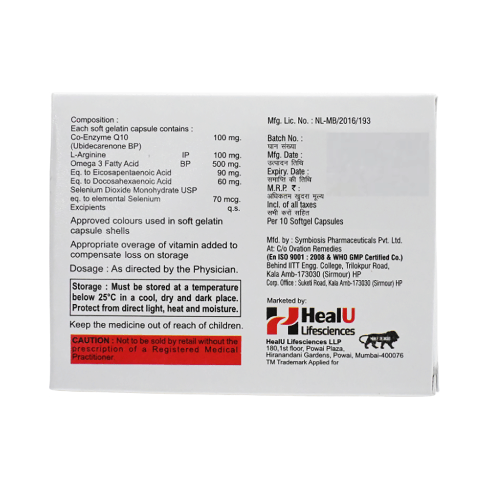Salt Composition: Coenzyme Q10 (100mg) + L-Arginine (100mg) + Omega-3 fatty acid (500mg) + Selenium (70mcg)