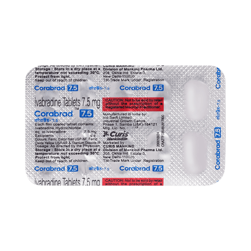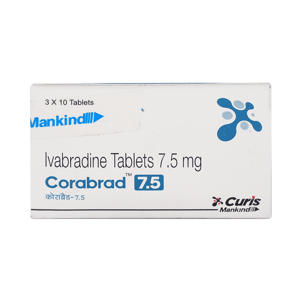 Corabrad 7.5mg Tablet is a medicine used for the treatment of angina (heart-related chest pain) and chronic (long-term) heart failure. It makes the heart work more efficiently by lowering the heart rate. This relieves chest pain and decreases the risk of hospitalization in heart failure patients. The dose will depend on what you are being treated for. Since the treatment for angina or heart failure is usually lifelong, you should not stop using it without talking to your doctor. It should be taken with food at the same time each day. If you take too much in one go, your heart could slow down too much and make you feel breathless or tired. If this happens, call a doctor.The most common side effects are temporary brightness/flashes in your vision, slow heart rate, high blood pressure, atrial fibrillation, dizziness, blurred vision, and ECG changes. Some side effects, such as fainting and significant changes to your heartbeat, may be very serious and may need urgent medical attention. Avoid driving until you know how this medicine will affect you.Do not use Corabrad 7.5mg Tablet if you have severe liver disease, a low resting heart rate, or a heart rhythm disorder. This medicine is also not suitable if you have very low blood pressure and heart failure that has recently become worse. This medicine interacts with certain other medicines used to treat high blood pressure, fungal infections, and HIV. Do not take it if you are pregnant, trying to become pregnant, or breastfeeding.