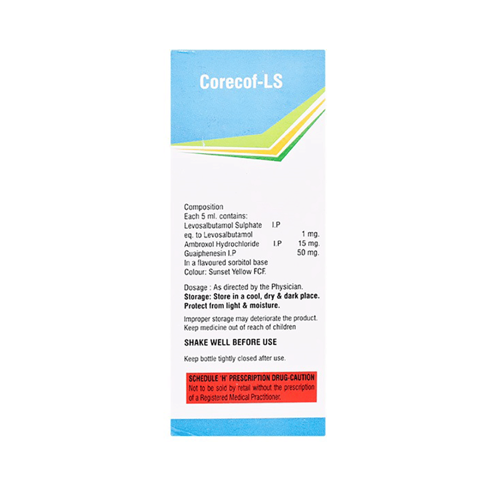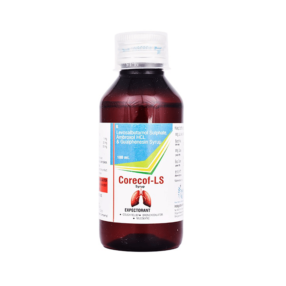Corecof-LS Syrup is a combination medicine used in the treatment of cough with mucus. It thins mucus in the nose, windpipe, and lungs, making it easier to cough out. It also provides relief from runny nose, sneezing, itching, and watery eyes. Corecof-LS Syrup is taken with or without food in a dose and duration as advised by the doctor. The dose you are given will depend on your condition and how you respond to the medicine. You should keep taking this medicine for as long as your doctor recommends. If you stop treatment too early your symptoms may come back and your condition may worsen. Let your healthcare team know about all other medications you are taking as some may affect, or be affected by this medicine.The most common side effects are nausea, diarrhea, stomach pain, vomiting, muscle cramp, headache, skin rash, and increased heart rate. Most of these are temporary and usually resolve with time. Contact your doctor straight away if you are at all concerned about any of these side effects. This medicine can also cause sleepiness, so do not drive or do anything that requires mental focus until you know how this medicine affects you. Avoid drinking alcohol while taking this medicine as it can make sleepiness worse.Never support self-medication or recommend your medicine to another person. It is beneficial to have plenty of fluids while taking this medication. Before taking this medicine, you should tell your doctor if you are pregnant, planning pregnancy, or breastfeeding. You should also tell your doctor if you have any kidney or liver diseases so that your doctor can prescribe a suitable dose for you.
