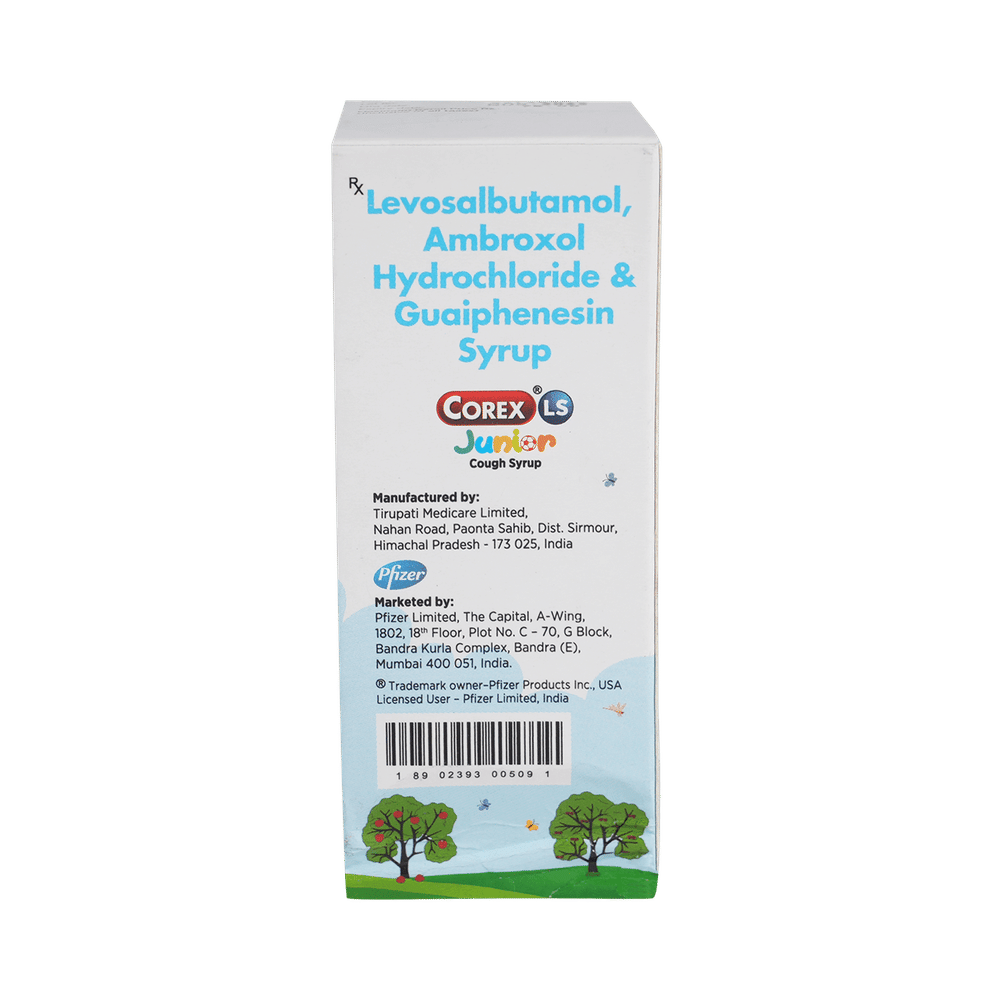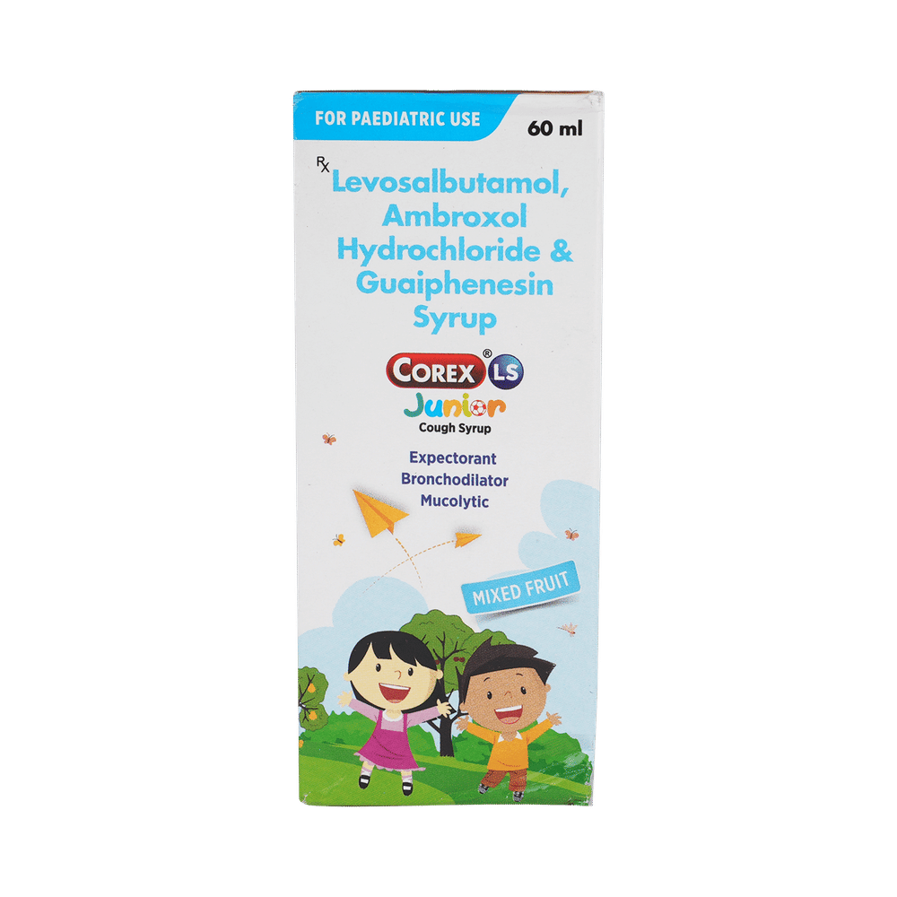 Corex LS Junior Syrup Mixed Fruit is a combination medicine used in the treatment of cough with mucus. It thins mucus in the nose, windpipe, and lungs, making it easier to cough out. It also provides relief from runny nose, sneezing, itching, and watery eyes. Corex LS Junior Syrup Mixed Fruit is taken with or without food in a dose and duration as advised by the doctor. The dose you are given will depend on your condition and how you respond to the medicine. You should keep taking this medicine for as long as your doctor recommends. If you stop treatment too early your symptoms may come back and your condition may worsen. Let your healthcare team know about all other medications you are taking as some may affect, or be affected by this medicine.The most common side effects are nausea, diarrhea, stomach pain, vomiting, muscle cramp, headache, skin rash, and increased heart rate. Most of these are temporary and usually resolve with time. Contact your doctor straight away if you are at all concerned about any of these side effects. This medicine can also cause sleepiness, so do not drive or do anything that requires mental focus until you know how this medicine affects you. Avoid drinking alcohol while taking this medicine as it can make sleepiness worse.Never support self-medication or recommend your medicine to another person. It is beneficial to have plenty of fluids while taking this medication. Before taking this medicine, you should tell your doctor if you are pregnant, planning pregnancy, or breastfeeding. You should also tell your doctor if you have any kidney or liver diseases so that your doctor can prescribe a suitable dose for you.