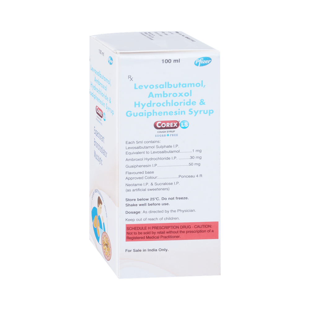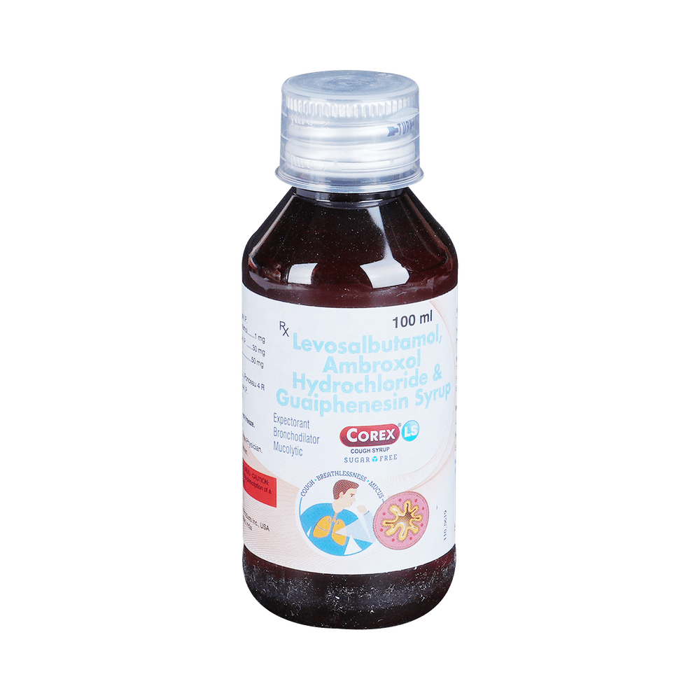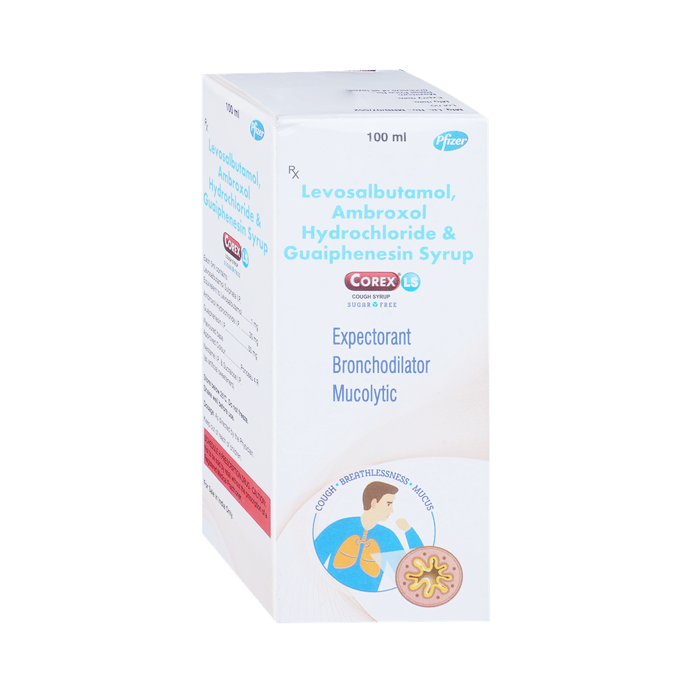 Corex LS Sugar Free Syrup is a combination medicine used in the treatment of cough with mucus. It thins mucus in the nose, windpipe, and lungs, making it easier to cough out. It also provides relief from runny nose, sneezing, itching, and watery eyes. Corex LS Sugar Free Syrup is taken with or without food in a dose and duration as advised by the doctor. The dose you are given will depend on your condition and how you respond to the medicine. You should keep taking this medicine for as long as your doctor recommends. If you stop treatment too early your symptoms may come back and your condition may worsen. Let your healthcare team know about all other medications you are taking as some may affect, or be affected by this medicine.The most common side effects are nausea, diarrhea, stomach pain, vomiting, muscle cramp, headache, skin rash, and increased heart rate. Most of these are temporary and usually resolve with time. Contact your doctor straight away if you are at all concerned about any of these side effects. This medicine can also cause sleepiness, so do not drive or do anything that requires mental focus until you know how this medicine affects you. Avoid drinking alcohol while taking this medicine as it can make sleepiness worse.Never support self-medication or recommend your medicine to another person. It is beneficial to have plenty of fluids while taking this medication. Before taking this medicine, you should tell your doctor if you are pregnant, planning pregnancy, or breastfeeding. You should also tell your doctor if you have any kidney or liver diseases so that your doctor can prescribe a suitable dose for you.