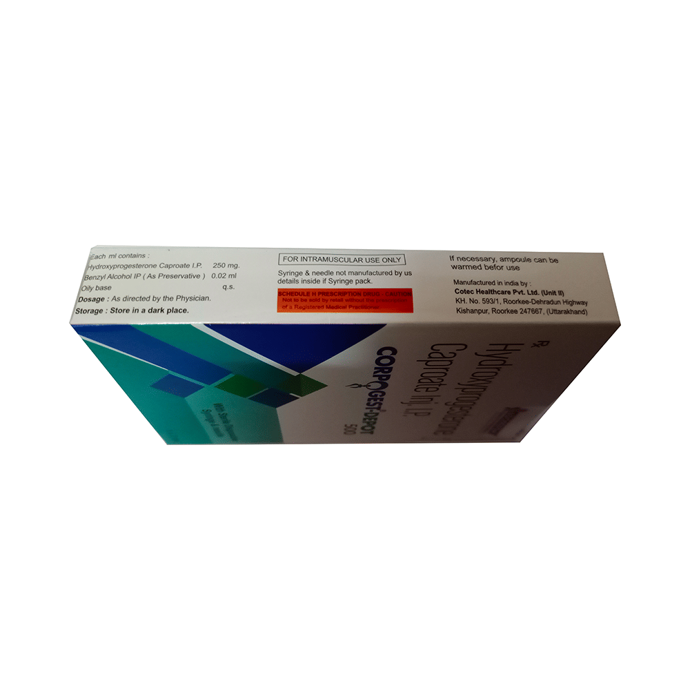 Corpogest-Depot 500 Injection is used to prevent premature labor in pregnant women in order to reduce the risk of giving birth too early (preterm birth). It prevents miscarriage and lowers the risk of premature birth in women who have had one premature delivery in the past. Corpogest-Depot 500 Injection is administered only by or under the supervision of a doctor. It should be taken as your doctor advice. Your doctor will decide how much you need to take and for how much time. You should take this injection for as long as it is prescribed for you.The most common side effects of this medicine include local site reactions at the injection site, nausea, itching, diarrhea, and rash. If any of these bothers you, let your doctor know. There may be ways of reducing or preventing them. It may affect blood sugar levels, so monitor your blood sugar regularly. It is better to inform the doctor if you notice yellowing of eyes or skin, dark urine, or stomach pain while using this medicine.Before taking this medicine inform doctor, if you have ever had any problems with your blood circulation or have diabetes, or any liver disease. Your doctor should also know about all other medicines you are taking as many of these may make this medicine less effective or change the way it works.