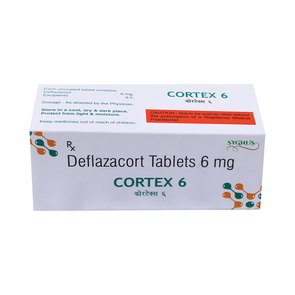Cortex 6 Tablet belongs to a group of medicines called steroids. It is used for the treatment of various diseases and conditions such as inflammatory conditions and autoimmune conditions. Cortex 6 Tablet works by inhibiting the release of substances that cause swelling or by changing how the immune system works. It can be taken on an empty stomach or after food. Taking the medicine regularly at the right times increases its effectiveness. It is important to keep taking the medicine regularly until your doctor tells you it is safe to stop.Use of this medicine may cause some common side effects such as increased appetite, weight gain, frequent urge to urinate, Cushing syndrome, cough, upper respiratory tract infection, abnormal hair growth, obesity, and nasopharyngitis. If any of these side effects bother you, let your doctor know.Cortex 6 Tablet can make it harder for you to fight off infections. Tell your doctor if you have any signs of infection such as a fever or sore throat. Before taking the medicine, you should let your doctor know of all the other medicines you are taking. Pregnant and breastfeeding women should consult their doctors before taking the medicine.