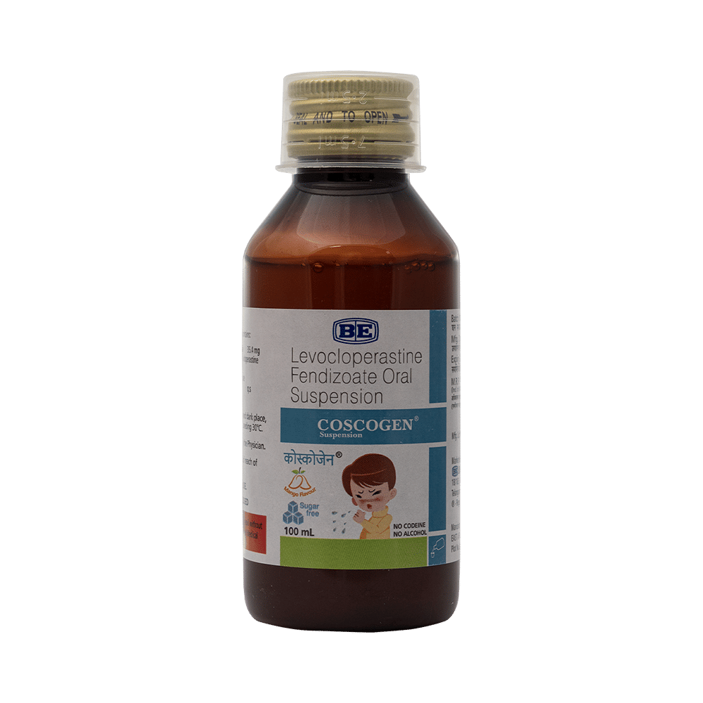 Coscogen Oral Suspension Mango Sugar Free is an antitussive (cough suppressants). It suppresses cough by reducing the activity of cough centre in the brain.