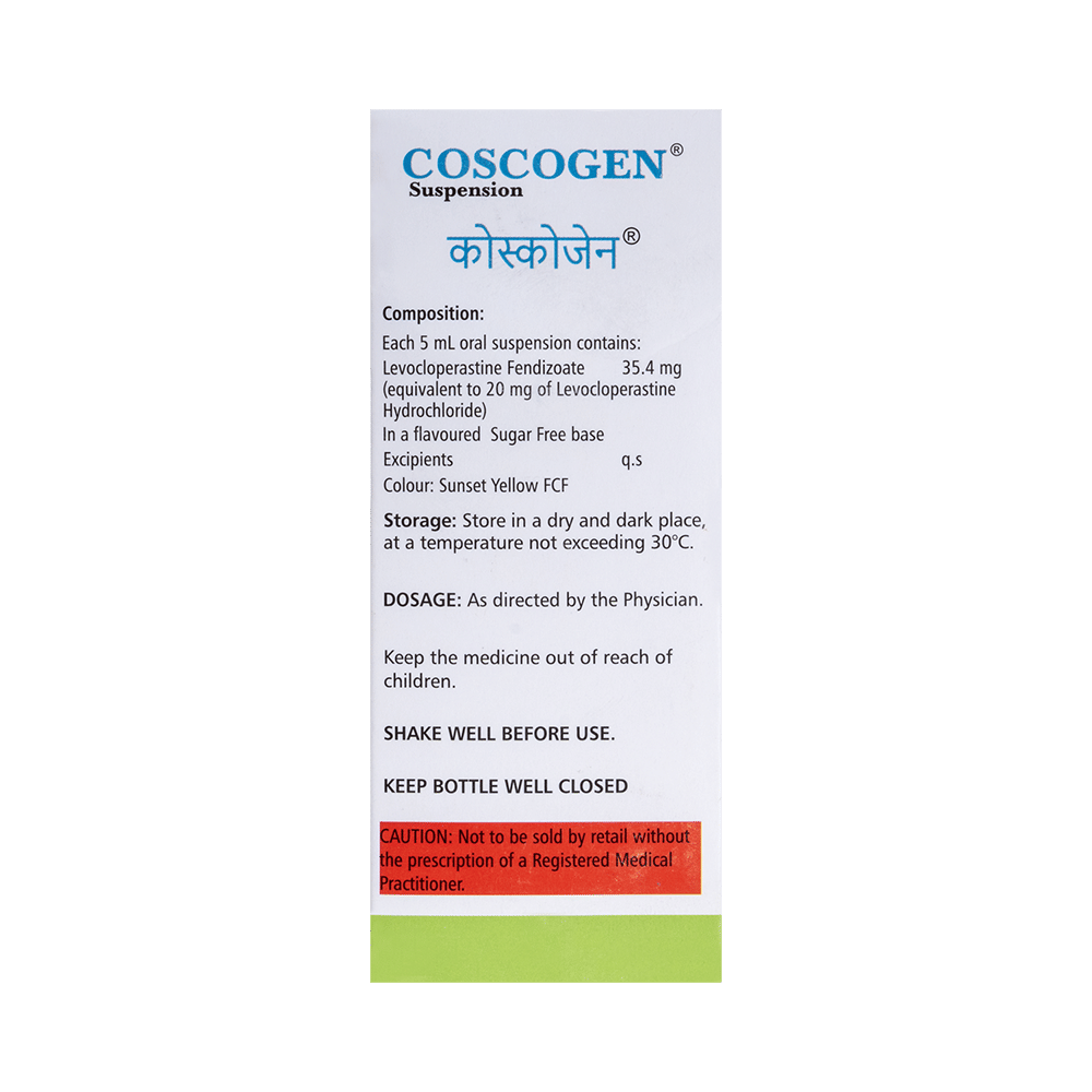 In Treatment of Dry coughA dry cough, also known as non-productive cough, is a cough where no phlegm or mucus is produced. This is irritating, usually associated with a tickly throat and may be caused due to cold, flu, allergies or throat irritants. Coscogen Oral Suspension Mango Sugar Free suppresses dry, hacking coughs. It will also relieve allergy symptoms like watery eyes, sneezing, runny nose or throat irritation and help you carry out your daily activities more easily.This medicine is safe and effective. Coscogen Oral Suspension Mango Sugar Free usually starts to work within a few minutes and the effects can last up to several hours. Take it as prescribed by the doctor. Do not stop using it unless you are advised to by your doctor.
