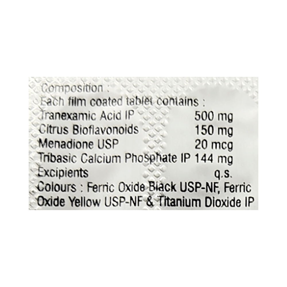 Salt Composition: Tranexamic Acid (500mg) + Tribasic Calcium Phosphate (144mg) + Menadione (20mcg) + Citrus Bioflavonoid (150mg)