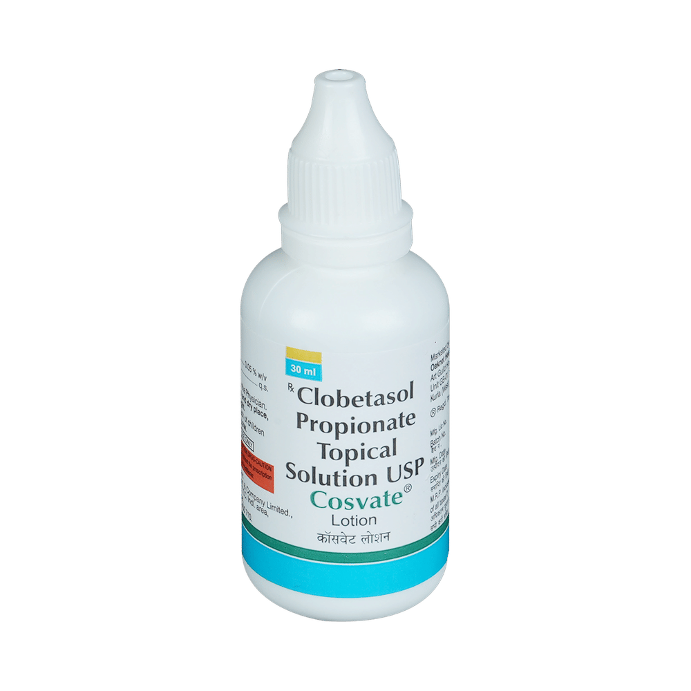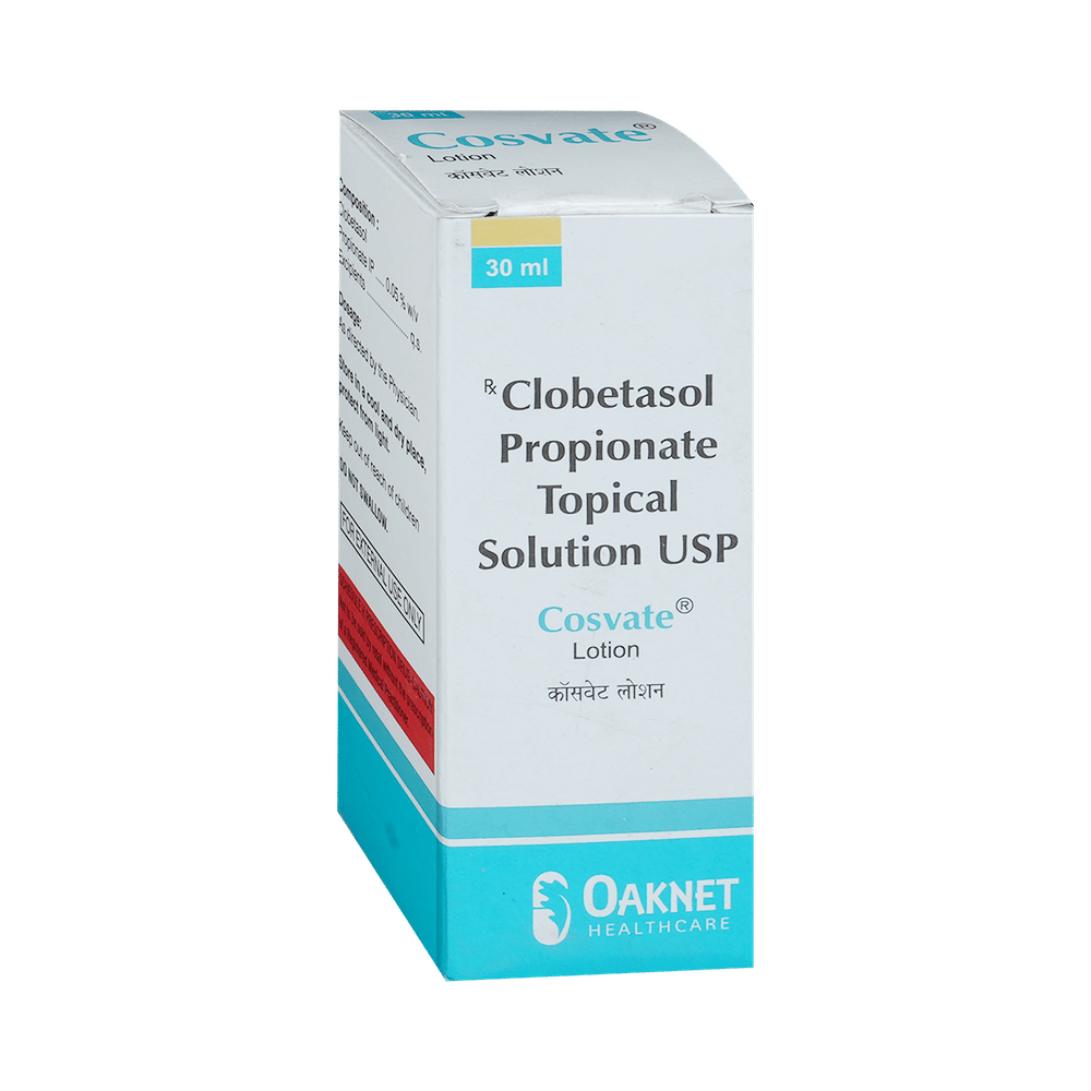 COSvate Lotion belongs to a group of medicines called steroids. It is used to treat various skin conditions such as dermatitis, eczema, and allergies. It works by reducing swelling, redness, and itchiness of the skin and prevents further irritation. COSvate Lotion is meant for external use and is to be used only as advised by your doctor. Wash and dry the affected area before applying a thin layer of the medicine. Avoid any contact with your eyes, nose, or mouth. Rinse it off with plenty of water if you accidentally get it in these areas. Avoid covering the treated area with airtight dressings such as bandages unless directed by a doctor.Using the medicine may cause skin thinning, burning sensation, irritation, redness, and swelling at the site of application. These are temporary and usually resolve with time. However, if they persist or worsen, let your doctor know. COSvate Lotion is not recommended to be used in children. Pregnant and breastfeeding mothers should consult their doctors before using this medicine.