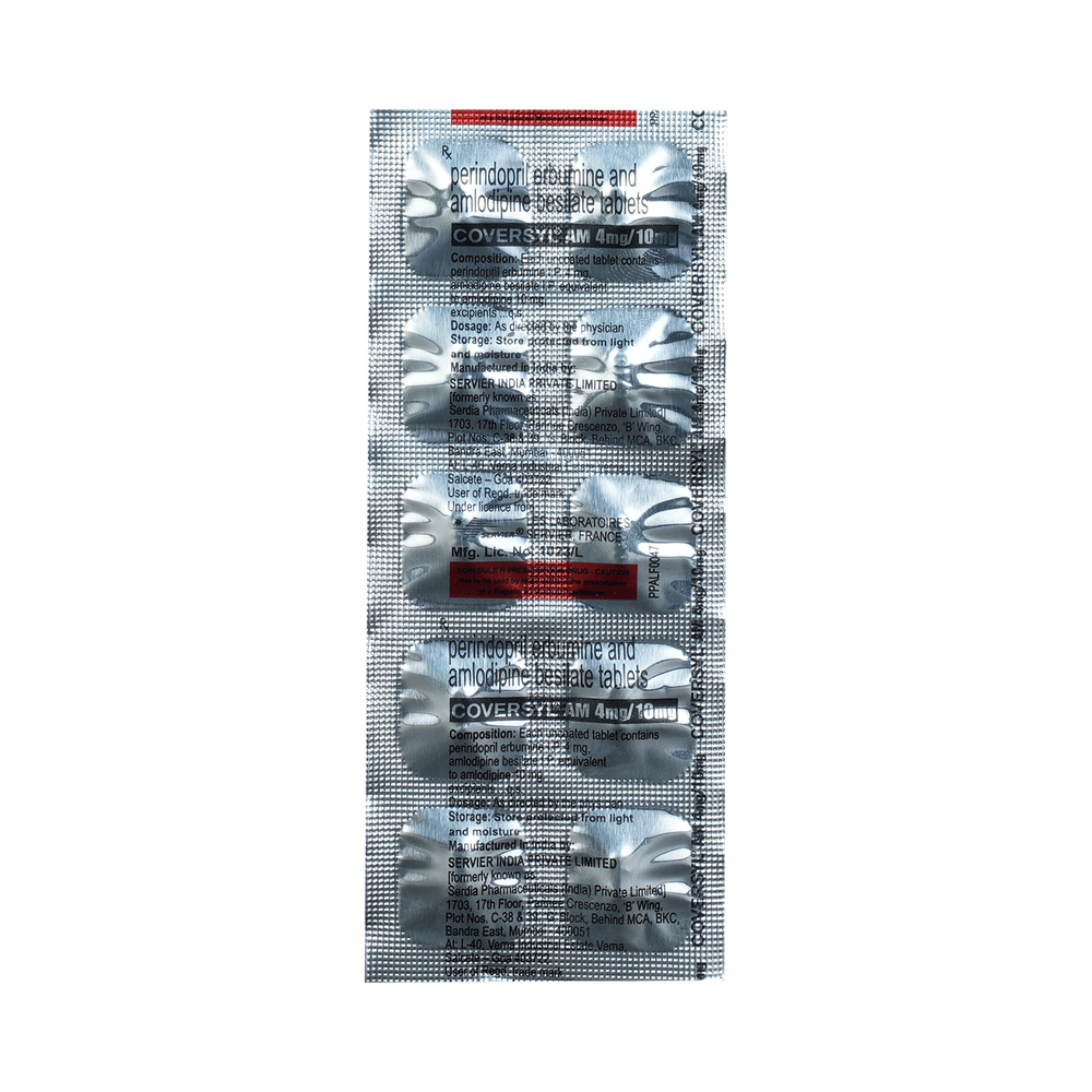 Coversyl-AM 4/10 Tablet is used to treat hypertension (high blood pressure). This is a combination of two medicines that controls blood pressure when a single medication is not effective. It helps to lower high blood pressure and thus reduces the chances of future heart attack and stroke. You can take Coversyl-AM 4/10 Tablet at any time of day, on empty stomach, but it is best to take it at the same time each day. Keep taking it for as long as advised by your doctor. Even if you feel well, do not stop this medicine on your own because high blood pressure often has no symptoms. If you stop taking it, your condition may get worse. Keeping active with regular exercise, reducing your weight and eating a healthy diet will also help control your blood pressure. Follow your doctor’s advice while taking this medicine.It may cause side effects like ankle swelling, headache, cough, weakness, shortness of breath, and tiredness. It may also cause dizziness, so do not drive or do anything that requires mental focus until you know how this medicine affects you. This might raise the level of potassium in the blood, hence avoid potassium rich food or supplements. You may be asked for regular monitoring of blood pressure, kidney function, and electrolytes level while on the treatment.Before taking it, let your doctor know if you have any liver or kidney problems. Pregnant or breastfeeding women should also consult their doctor for advice before taking this medicine. You also need to tell your doctor what other medicines you are taking especially those used to treat high blood pressure or heart conditions.
