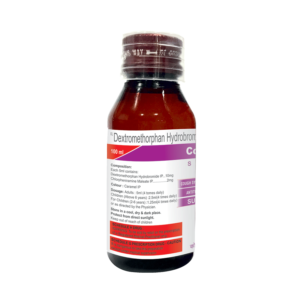 Cozin DX Syrup Sugar Free is a combination of two medicines: Chlorpheniramine Maleate and Dextromethorphan Hydrobromide, which relieves dry cough. Chlorpheniramine Maleate is an antiallergic which helps reduce cough associated with allergies by blocking the effects of a chemical messenger, histamine. Dextromethorphan Hydrobromide is a cough suppressant which relieves cough by reducing the activity of cough center in the brain.