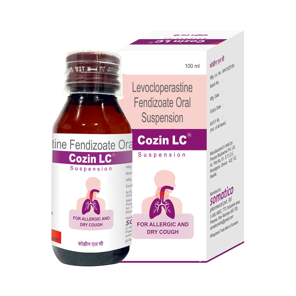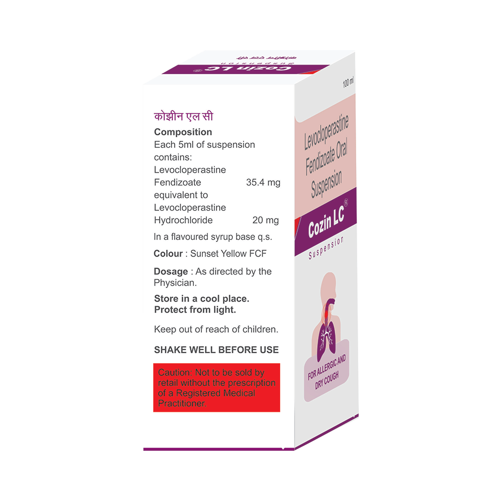 Cozin LC Syrup is an antitussive medicine. It is used for the treatment of dry cough. It suppresses the cough by reducing the activity of the cough center in the brain. Cozin LC Syrup can be taken with or without food, but take it at the same time to get the most benefit. It should be taken as your doctor's advice. The dose and how often you take it depends on what you are taking it for. Your doctor will decide how much you need to improve your symptoms. The dose may depend on your age and the present medical condition. Take it for as long as it is prescribed. Inform your doctor if symptoms do not get improved within 7 days of the treatment.The most common side effects of this medicine include nausea, drowsiness, dizziness, dryness in the mouth, and fatigue. If these bother you or appear serious, let your doctor know. There may be ways of reducing or preventing them. Generally, it is advised to drink plenty of fluids while on treatment with this medicine. To overcome dizziness, avoid driving or attention-seeking activities.Before taking this medicine, let your doctor know if you are pregnant, or breastfeeding. Your doctor should also know about all other medicines you are taking as many of these may make this medicine less effective or change the way it works.