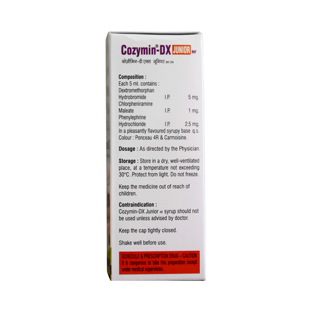 Cozymin-DX Junior RF Syrup is a medicine used in the treatment of common cold and cough. It can provide quick relief from cough and common cold symptoms like runny nose, stuffy nose, sneezing, watery eyes, and congestion or stuffiness. Cozymin-DX Junior RF Syrup is taken with or without food in a dose and duration as advised by the doctor. The dose you are given will depend on your condition and how you respond to the medicine. You should keep taking this medicine for as long as your doctor recommends. If you stop treatment too early your symptoms may come back and your condition may worsen. Let your healthcare team know about all other medications you are taking as some may affect, or be affected by this medicine.Common side effects of this medicine include headache, sedation, double vision, vomiting, diarrhea, dry mouth, and nausea. Most of these are temporary and usually resolve with time. Contact your doctor straight away if you are at all concerned about any of these side effects. This medicine can also cause sleepiness, so do not drive or do anything that requires mental focus until you know how this medicine affects you. Avoid drinking alcohol while taking this medicine as it can worsen your sleepiness.Never support self-medication or recommend your medicine to another person. It is beneficial to have plenty of fluids while taking this medication. Before taking this medicine, you should tell your doctor if you are pregnant, planning pregnancy or breastfeeding. You should also tell your doctor if you have any kidney or liver diseases so that your doctor can prescribe a suitable dose for you.