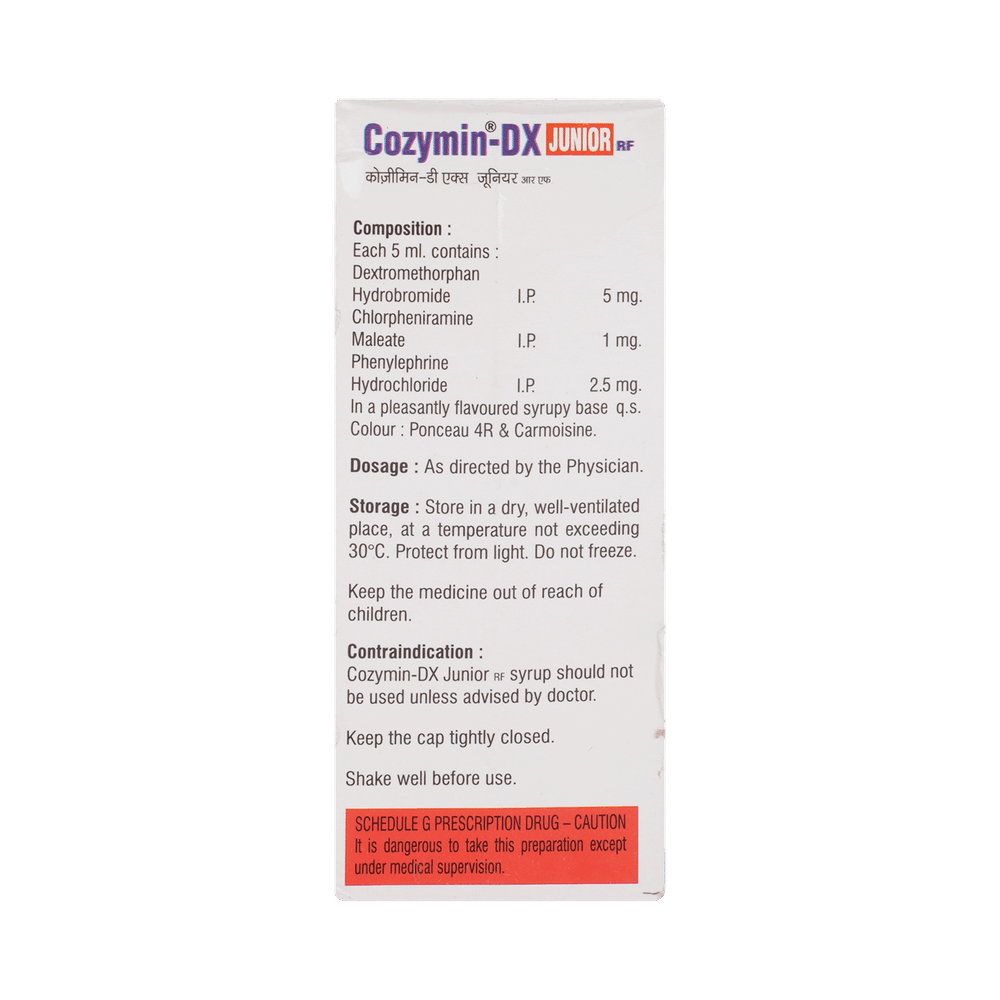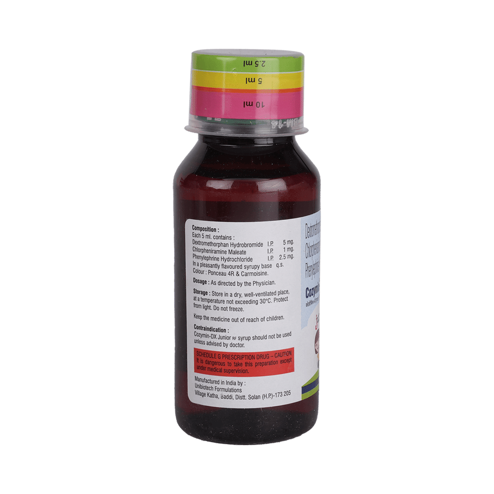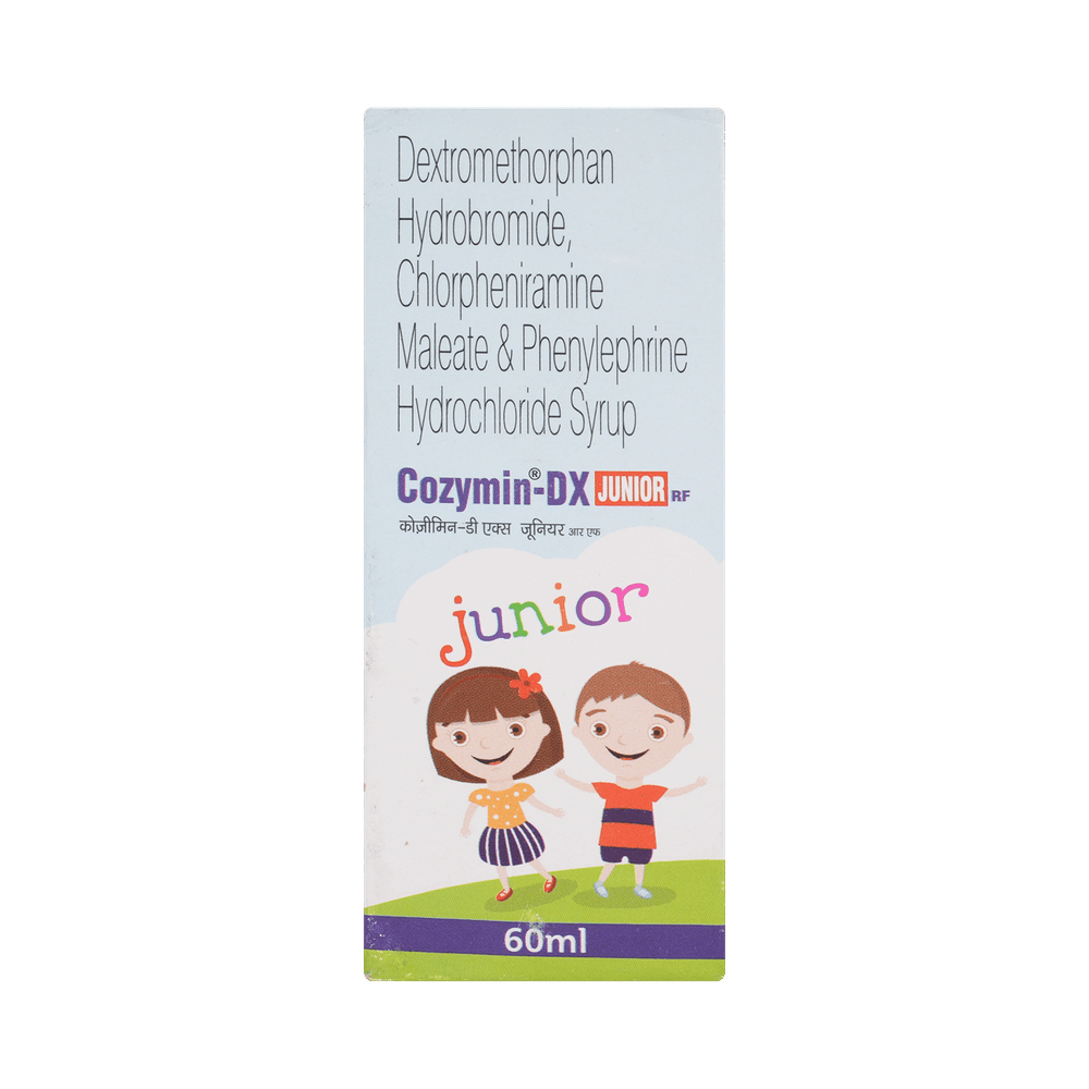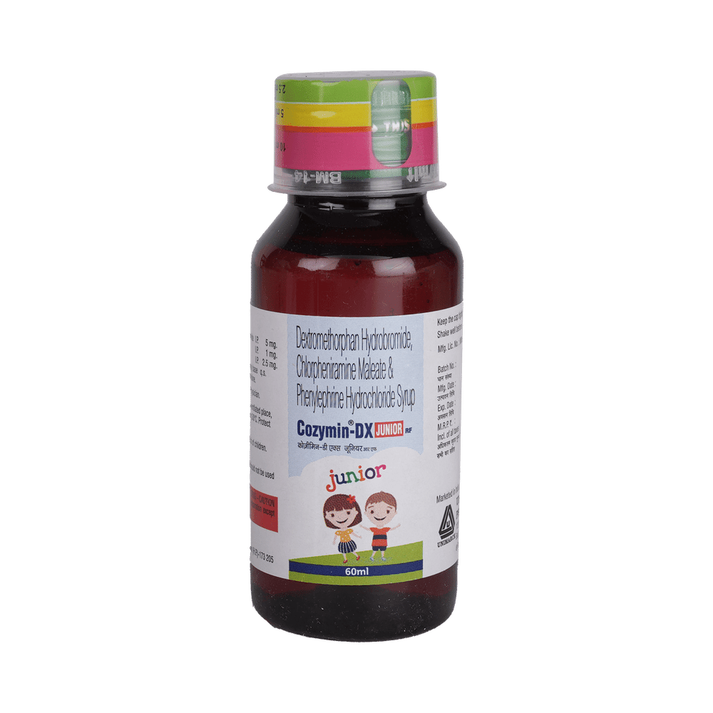 Cozymin-DX Junior Syrup is a combination of two medicines used in the treatment of dry cough. It can provide temporary relief of cough due to throat irritation, sneezing, and running nose. It works by reducing the activity of the brain's cough center and blocking the effects of histamine. Cozymin-DX Junior Syrup is taken with or without food in a dose and duration as advised by the doctor. The dose you are given will depend on your condition and how you respond to the medicine. You should keep taking this medicine for as long as your doctor recommends. If you stop treatment too early your symptoms may come back and your condition may worsen. Let your doctor know about all other medications you are taking as some may affect, or be affected by this medicine.The most common side effects are sedation, somnolence, and dizziness. Most of these are temporary and usually resolve with time. Contact your doctor straight away if you are at all concerned about any of these side effects. If you experience dizziness and sleepiness, so do not drive or do anything that requires mental focus until you know how this medicine affects you. Avoid drinking alcohol while taking this medicine as it can make dizziness worse.It is beneficial to have plenty of fluids while taking this medication. Before taking it, you should tell your doctor if you have liver diseases so that your doctor can prescribe a suitable dose for you. Pregnant or breastfeeding women should also consult their doctor before taking this medicine.