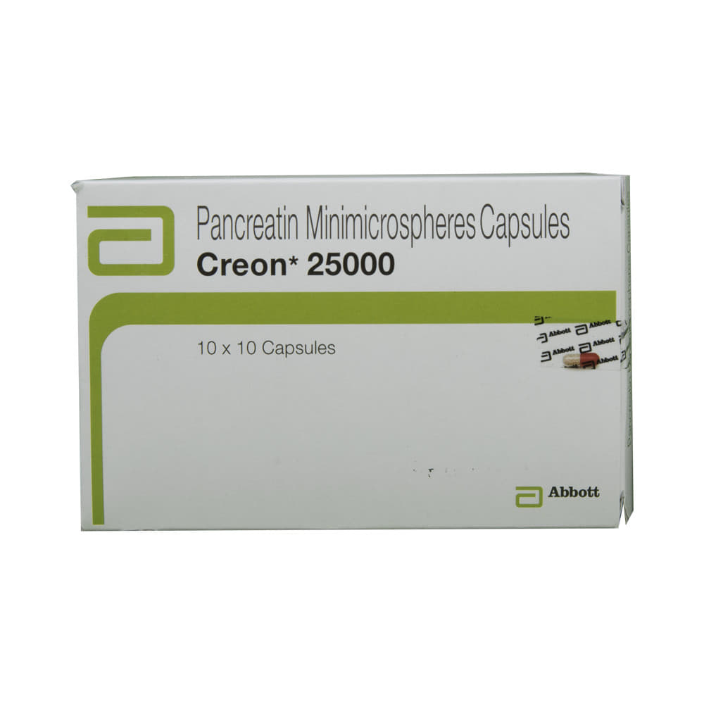 In Treatment of Pancreatic enzyme deficiencyCreon 25000 Capsule is an enzyme supplement for people who do not make enough naturally in their bodies to digest food properly. The enzymes in this medicine help digest food (fats, carbohydrates, and protein) as it passes through the gut. It should be taken with your meal or snack to help it work effectively. Take Creon 25000 Capsule for as long as it is prescribed for maximum benefits. Some may need it for the rest of their lives. You might also be asked to alter your diet to help with digestion.