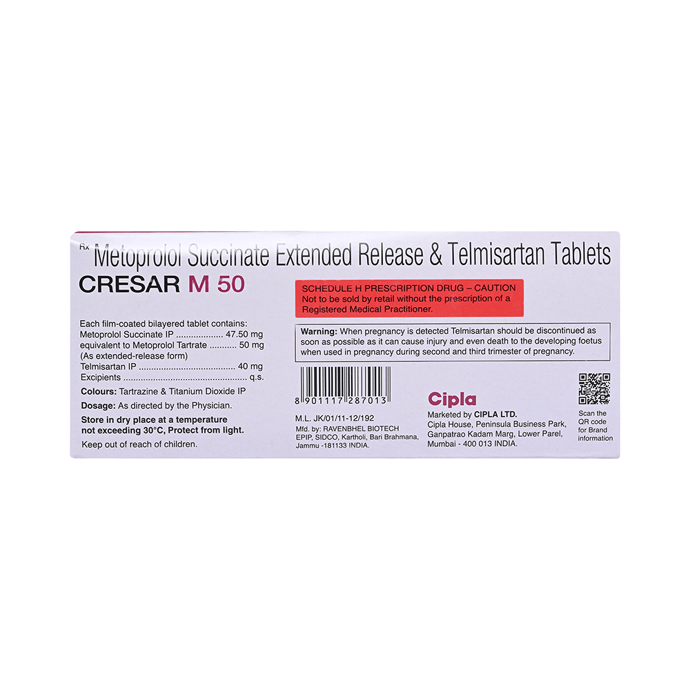 Cresar M 40mg/50mg Tablet is a combination of two blood-pressure lowering medicines: Telmisartan and Metoprolol Succinate.