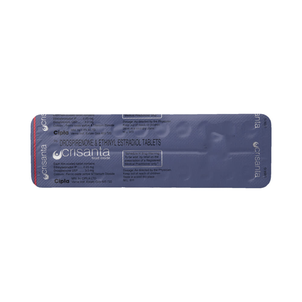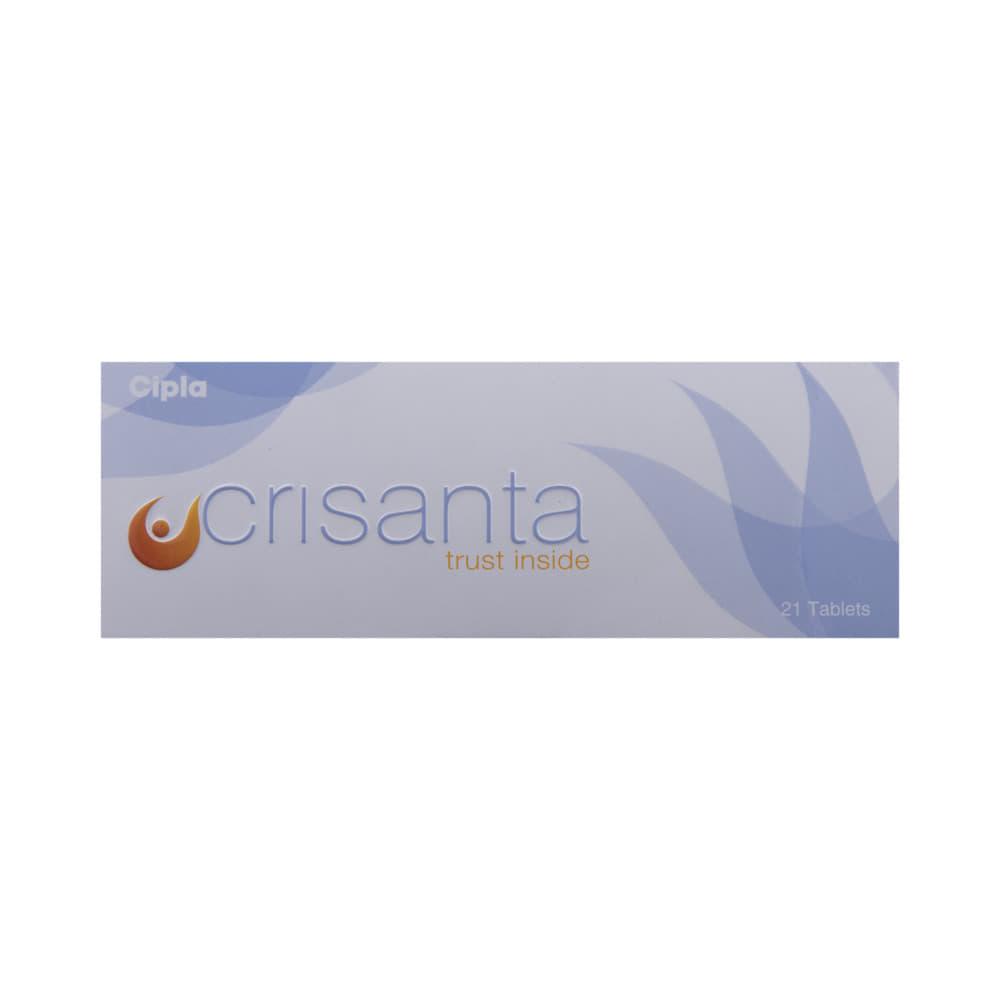 Crisanta Tablet is a combination of two medicines used for contraception (to prevent pregnancy) and in the treatment of irregular periods. It helps to prevent the release and fertilization of the egg. Crisanta Tablet can be taken with or without food, but take it at the same time to get the most benefit. It should be taken as per your doctor's advice. You will have to take the pill on day one of your menstrual cycle and continue taking it for a whole month. Once the pack gets over, start with a new one. If you experience vomiting within 4 hours of dose intake, take another tablet. In case you missed your dose and you are late by 12 hours in taking the missed dose, use a condom during intercourse for a period of 2 days.Nausea, headache, breast pain, and mood changes, vaginal discharge, and vaginal yeast infection are some commonly seen side effects of this medicine. If these bother you or appear serious, let your doctor know. There may be ways of reducing or preventing them. You might experience spotting or bleeding between menstrual periods or missed periods. Consult with your doctor if this occurs frequently or persists longer. Inform your doctor if you notice swelling and pain in your limbs, shortness of breath, chest pain or changes in vision, as it may be a sign of a blood clot.Before taking this medicine, let your doctor know if you smoke and are over 35, or if you have ever had a heart attack or have cancer of the uterus/cervix, or vagina. Your doctor should also know about all other medicines you are taking as many of these may make this medicine less effective or change the way it works. Do not take the medicine if you are pregnant already or breastfeeding. You might be asked for a regular check-up of blood pressure, cholesterol, and blood sugar level while on treatment.