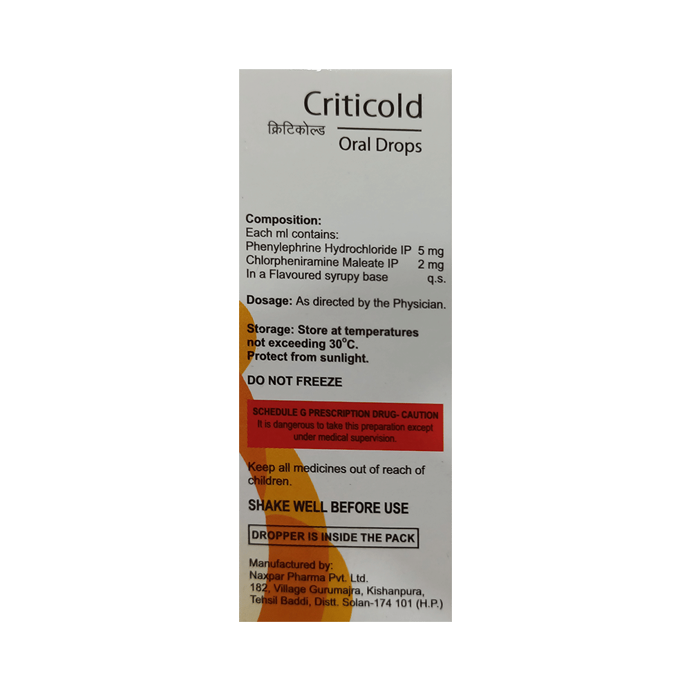 Criticold Oral Drops Orange is a combination medicine used for the symptomatic treatment of common cold in children. It helps relieve discomfort caused by a runny nose, blocked nose, and sneezing, allowing the child to breathe more easily and feel better. Criticold Oral Drops Orange may be given to your child with or without food. Always follow the exact dose and duration prescribed by the doctor. The dosage will depend on your child’s age, weight, and the severity of symptoms. Do not stop the medicine early, even if your child seems to be feeling better, unless advised by the doctor.Common side effects may include nausea, vomiting, or headache. These are usually mild and temporary. However, if you notice anything unusual or are concerned about how your child is responding to the medicine, consult your doctor promptly. This medicine may also cause drowsiness, so avoid engaging your child in activities that require alertness until you know how it affects them.Make sure your child stays well hydrated while taking Criticold Oral Drops Orange. Inform your doctor if your child has any history of liver or kidney problems, as the dose may need to be adjusted accordingly.Note: As per the Ministry of Health and Family Welfare, Criticold Oral Drops Orange should not be used in children below 4 years of age.