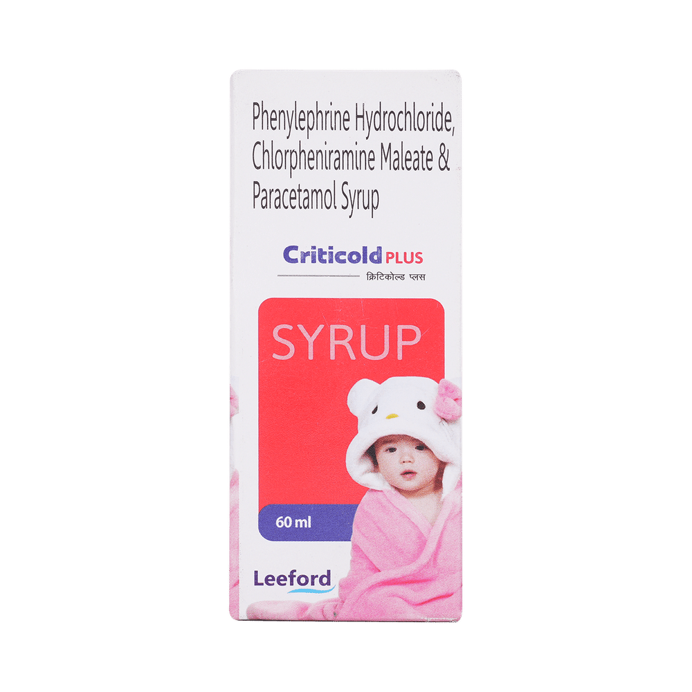 Criticold Plus Syrup is a medicine used in the treatment of common cold symptoms. It provides relief from symptoms such as headache, sore throat, runny nose, muscular pain, and fever. Criticold Plus Syrup can be taken with or without food. The dose and duration will depend on the severity of your condition. You should keep taking the medicine even if you feel better until the doctor says it is alright to stop using it.Using this medicine may cause a few common side effects such as nausea, vomiting, sleepiness, dizziness, and headache. If any of these side effects do not resolve with time or get worse, you should let your doctor know. Your doctor may be able to suggest ways of preventing or reducing the side effects. In general, you should try to use the smallest amount necessary to control your symptoms.Before using the medicine, you should tell your doctor if you have any other medical conditions or disorders. To make sure it is safe, you should let your doctor know all the other medicines you are taking. Also, tell your doctor if you have any problems with the liver or kidneys. Avoid consumption of alcohol while on treatment with this medicine as it may increase the chance of some side effects. Pregnant and breastfeeding women should consult their doctors first before using the medicine.