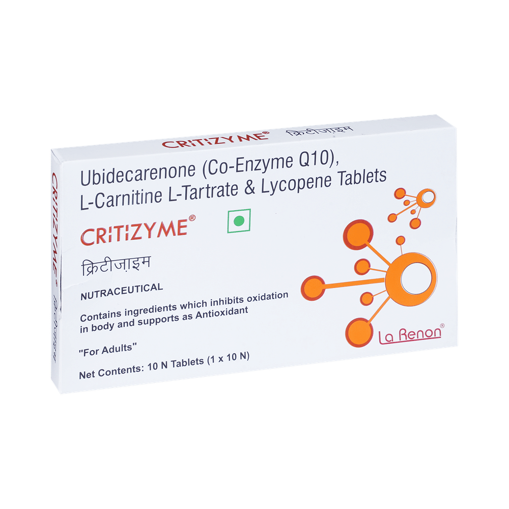 Critizyme Tablet is a combination of three medicines: Coenzyme Q10, Levo-carnitine and Lycopene. Coenzyme Q10 is an antioxidant which protects the body from damage by chemicals (free radicals). Levo-carnitine and Lycopene provide essential nutrients.