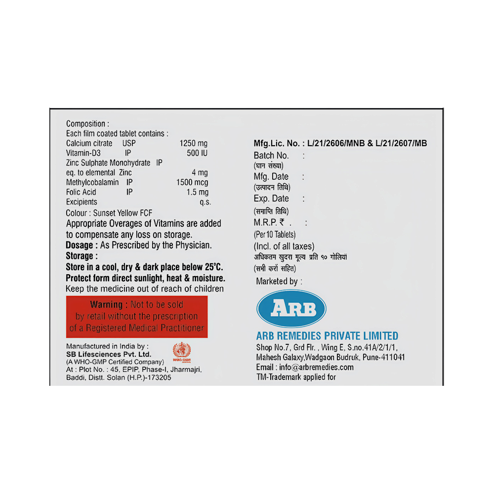 Salt Composition: Calcium citrate (1250mg) + Vitamin D3 (500IU) + Methylcobalamin (1500mcg) + Zinc Sulphate Monohydrate (4mg) + Folic Acid (1.5mg)