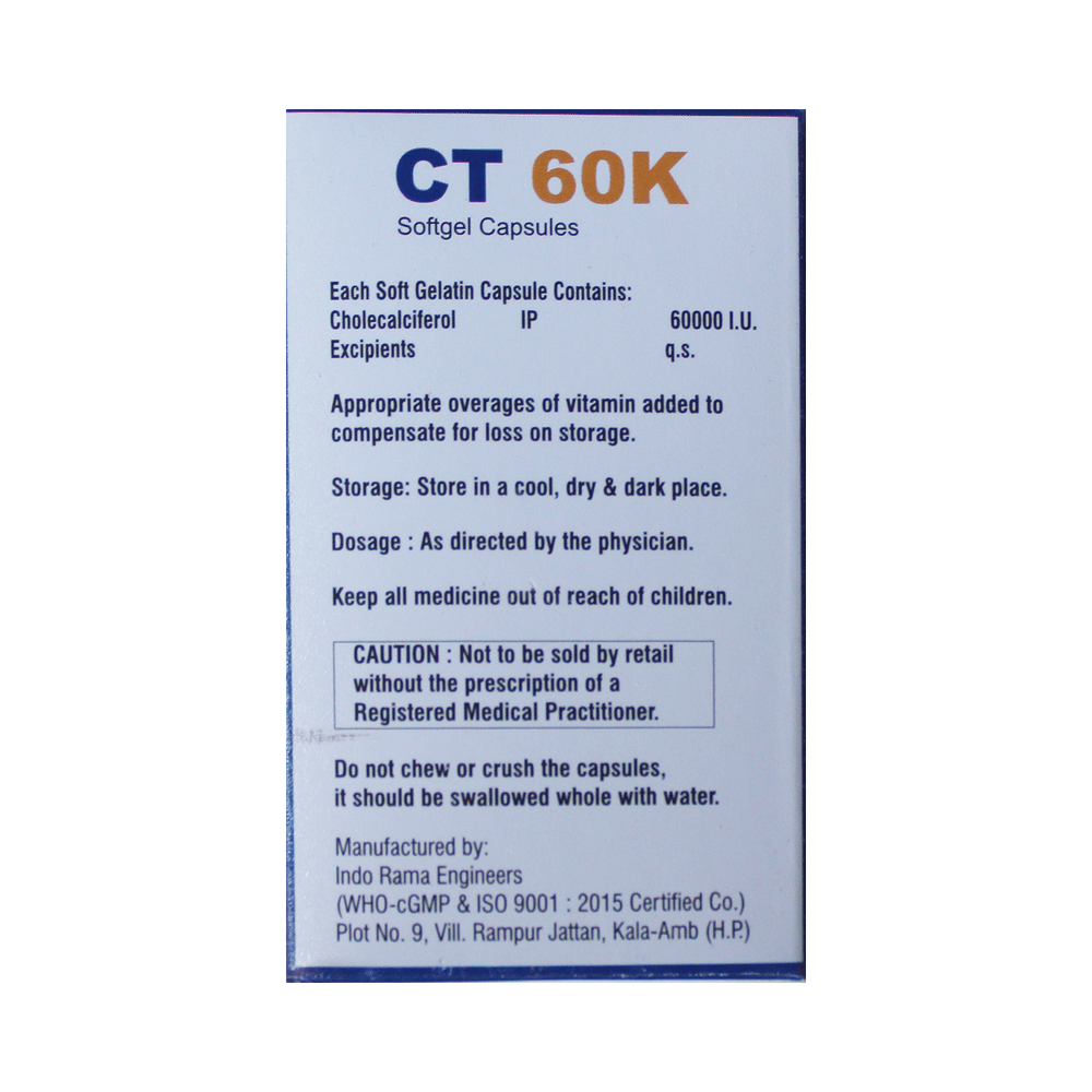 CT 60K Softgel Capsule is used in the treatment of vitamin D deficiency and osteoporosis. It helps the body to absorb calcium. Calcium is essential for maintaining strong and healthy bones. It is used when your diet does not provide enough calcium. CT 60K Softgel Capsule should be taken as directed by your doctor. It is best taken with or after food, as this helps your body absorb it, and you should take it regularly to get the most benefits. If you are using it to treat osteoporosis, you will also be prescribed other medicines. This medicine may be only part of a complete treatment program that includes making changes to your diet and taking calcium and vitamin supplements. Learn about the foods you should eat to ensure you get enough calcium and vitamin D.CT 60K Softgel Capsule has few side effects, and none are common. If you take too much, you may feel weakness, muscle pain, or a metallic taste in your mouth. If you experience any such side effects, speak with your doctor. They may be able to help you reduce or treat the symptoms.Before taking this medicine, tell your doctor if you have high calcium levels in your blood or if you have any heart, kidney, or liver disease. Some other medicines can decrease the absorption of vitamin D3, so let your doctor know about all the other medicines you are taking to make sure you are safe. This medicine may help during pregnancy when your body needs more vitamin D, but too much could harm your baby. Discuss it with your doctor.