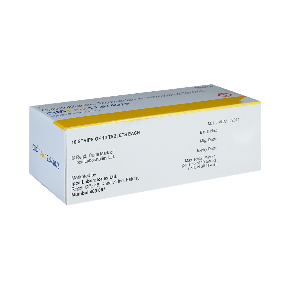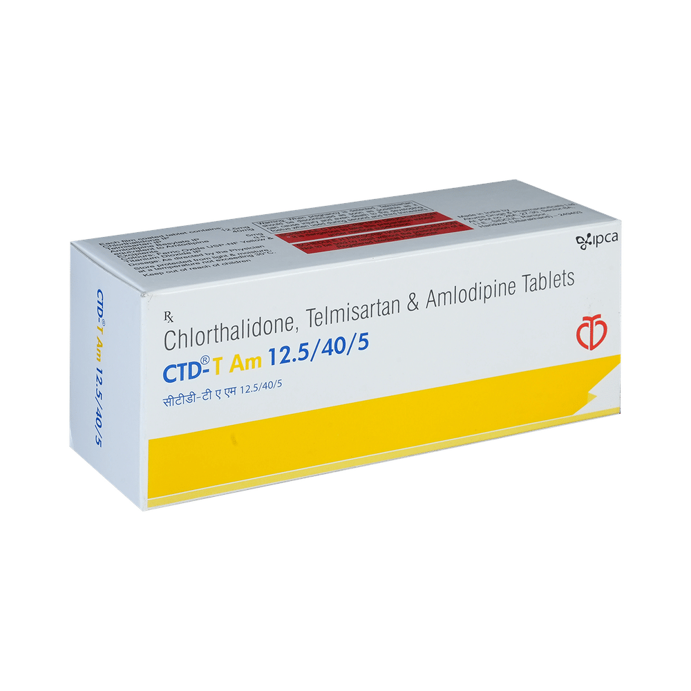 CTD-T AM 12.5/40/5 Tablet is a combination of medicines used to treat hypertension (high blood pressure). It helps to lower high blood pressure, thus reducing the chances of future heart attacks and strokes. Regular use of CTD-T AM 12.5/40/5 Tablet, along with a healthy lifestyle, helps in better blood pressure control. CTD-T AM 12.5/40/5 Tablet may be taken with or without food. The dose will depend on your condition and how you respond to the medicine. Try to take it at the same time each day. It is important to keep taking this medicine until your doctor tells you not to. It contains a diuretic (water pill) and will make you urinate more. Use this medicine regularly to get the most benefit from it, even if you feel well. High blood pressure does not usually have symptoms, and if you stop taking it, your risk of heart attack or stroke may increase.The most common side effects of this medicine include dizziness, fatigue, coughing, nausea, and edema. Consult your doctor if any of these bother you, get worse, or won't go away. They may be able to guide you.Before taking it, let your doctor know if you have any liver or kidney problems. Pregnant or breastfeeding women should also consult their doctor for advice before taking this medicine. You also need to tell your doctor what other medicines you are taking, especially those used to treat high blood pressure or heart conditions. You should have your blood pressure, kidney function, level of electrolytes, and blood sugar level checked regularly to ensure this medicine works properly.