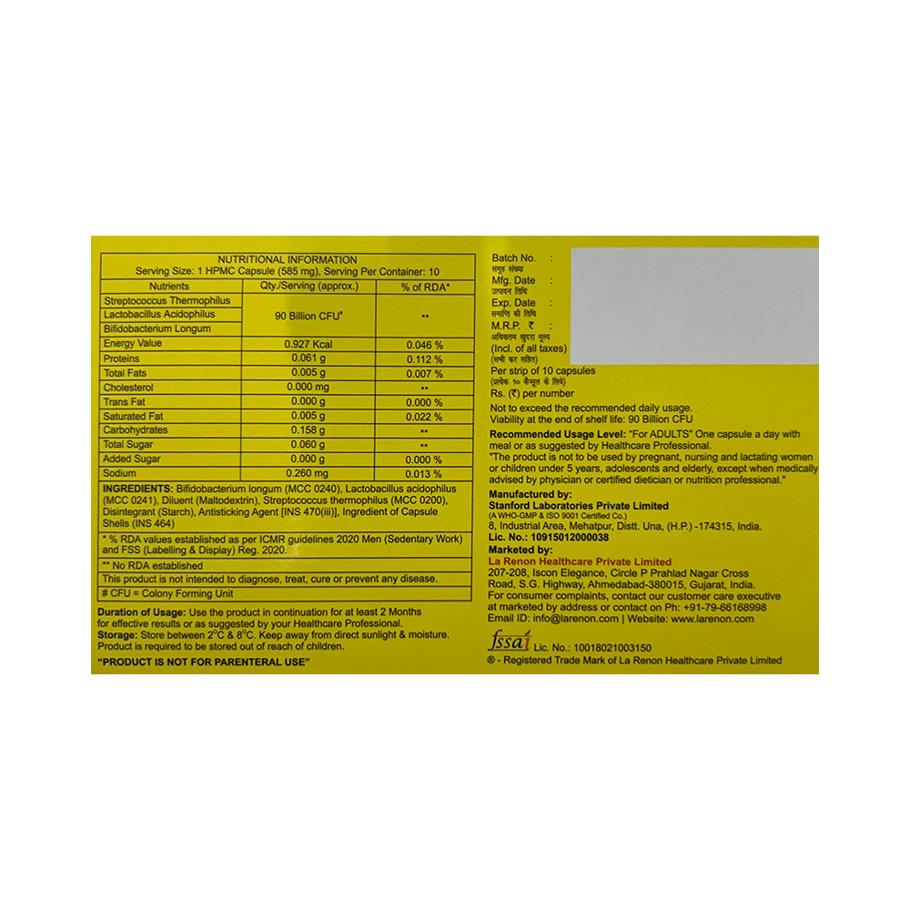 Salt Composition: Streptococcus Thermophilus (90Billion CFU) + Lactobacillus Acidophilus (NA) + Bifidobacterium longum (NA)