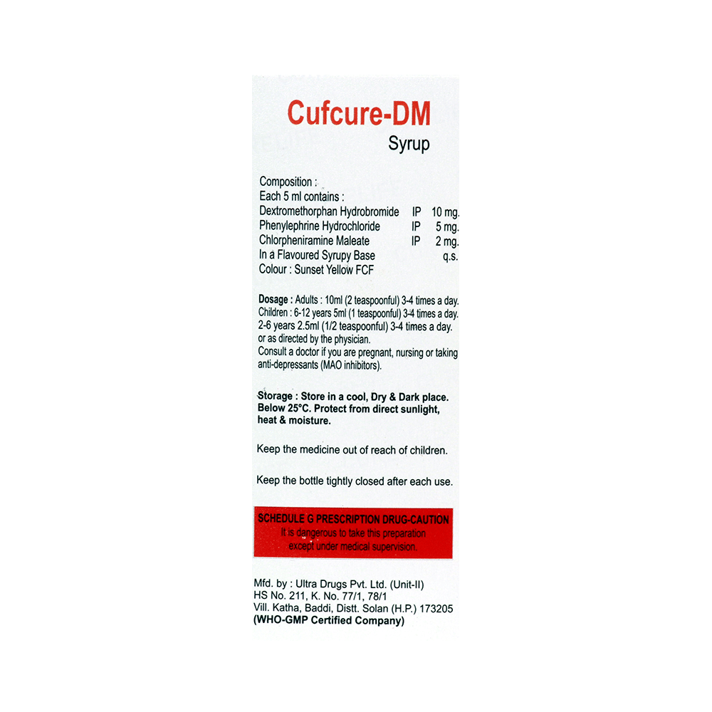 Cufcure-DM Syrup is a medicine used in the treatment of common cold and cough. It can provide quick relief from cough and common cold symptoms like runny nose, stuffy nose, sneezing, watery eyes, and congestion or stuffiness. Cufcure-DM Syrup is taken with or without food in a dose and duration as advised by the doctor. The dose you are given will depend on your condition and how you respond to the medicine. You should keep taking this medicine for as long as your doctor recommends. If you stop treatment too early your symptoms may come back and your condition may worsen. Let your healthcare team know about all other medications you are taking as some may affect, or be affected by this medicine.Common side effects of this medicine include headache, sedation, double vision, vomiting, diarrhea, dry mouth, and nausea. Most of these are temporary and usually resolve with time. Contact your doctor straight away if you are at all concerned about any of these side effects. This medicine can also cause sleepiness, so do not drive or do anything that requires mental focus until you know how this medicine affects you. Avoid drinking alcohol while taking this medicine as it can worsen your sleepiness.Never support self-medication or recommend your medicine to another person. It is beneficial to have plenty of fluids while taking this medication. Before taking this medicine, you should tell your doctor if you are pregnant, planning pregnancy or breastfeeding. You should also tell your doctor if you have any kidney or liver diseases so that your doctor can prescribe a suitable dose for you.