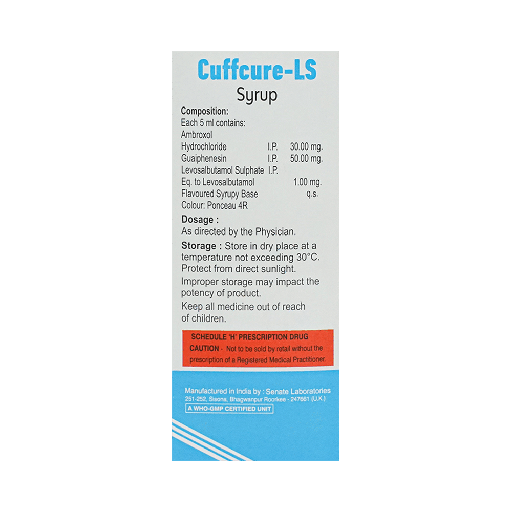 Cuffcure-LS Syrup is used in the treatment of cough with mucus. It thins mucus in the nose, windpipe and lungs, making it easier to cough out. It also provides relief from runny nose, sneezing, itching, and watery eyes. Cuffcure-LS Syrup is taken with or without food in a dose and duration as advised by the doctor. The dose you are given will depend on your condition and how you respond to the medicine. You should keep taking this medicine for as long as your doctor recommends. If you stop treatment too early your symptoms may come back and your condition may worsen. Let your healthcare team know about all other medications you are taking as some may affect, or be affected by this medicine.The most common side effects are dizziness, vomiting, change in taste, diarrhea, headache, and rashes. Most of these are temporary and usually resolve with time. Contact your doctor straight away if you are at all concerned about any of these side effects. This medicine can also cause sleepiness, so do not drive or do anything that requires mental focus until you know how this medicine affects you. Avoid drinking alcohol while taking this medicine as it can make sleepiness worse.Never support self-medication or recommend your medicine to another person. It is beneficial to have plenty of fluids while taking this medication. Before taking this medicine, you should tell your doctor if you are pregnant, planning pregnancy or breastfeeding. You should also tell your doctor if you have any kidney or liver diseases so that your doctor can prescribe a suitable dose for you.
