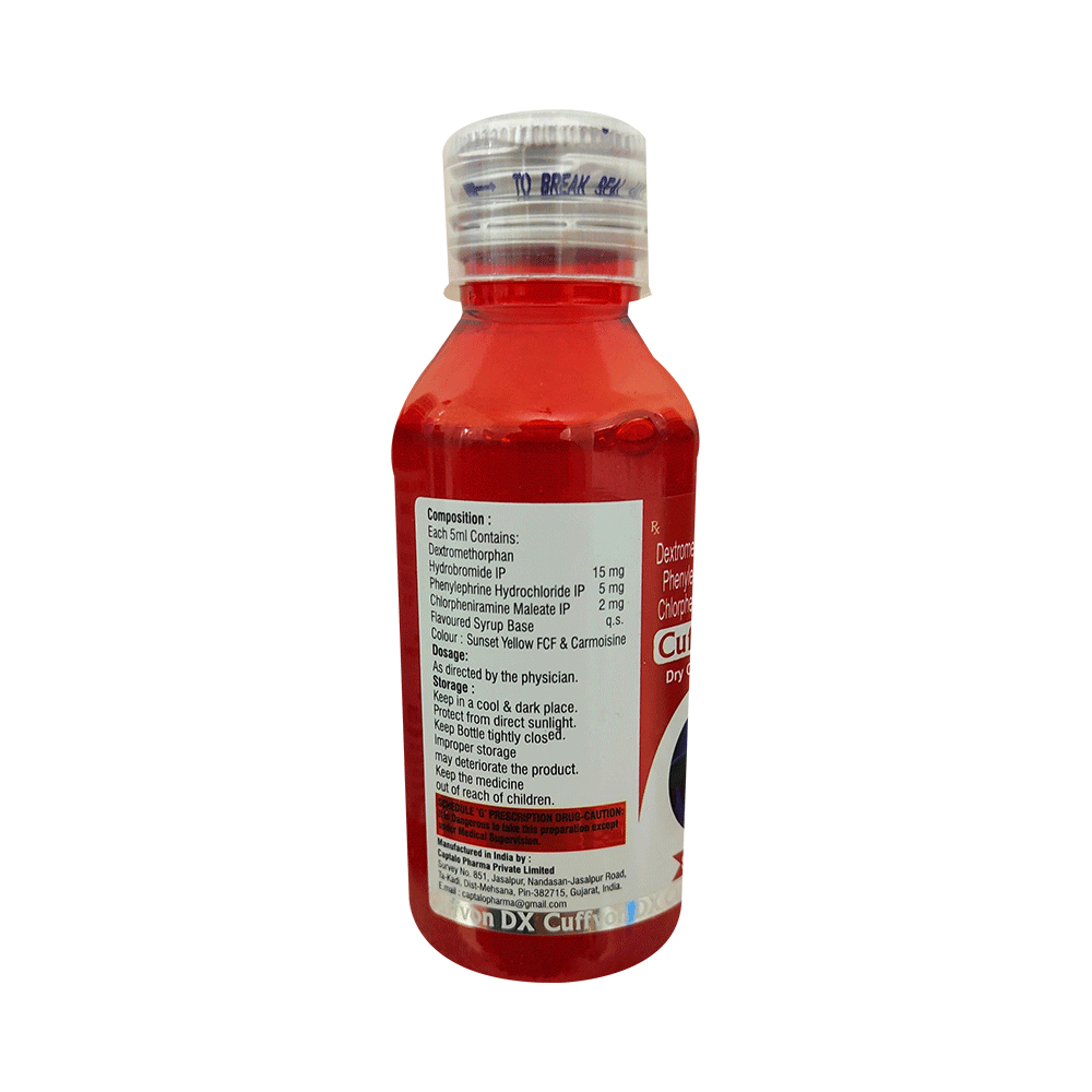 In Treatment of Dry coughA dry cough, also known as non-productive cough, is a cough where no phlegm or mucus is produced. This is irritating, usually associated with a tickly throat and may be caused due to cold, flu, allergies or throat irritants. Cuffvon DX Syrup Sugar Free suppresses dry, hacking coughs. It will also relieve allergy symptoms like watery eyes, sneezing, runny nose or throat irritation and help you carry out your daily activities more easily. This medicine can provide a quick relief and the effects can last up to several hours.In Common coldCuffvon DX Syrup Sugar Free effectively relieves symptoms associated with common cold, such as a blocked nose, runny nose, watery eyes, sneezing, and congestion or stuffiness. It helps loosen thick mucus, making it easier to cough out. It also shrinks the blood vessels and provides rapid relief that lasts for several hours. These actions make breathing easier. Cuffvon DX Syrup Sugar Free usually starts working within a few minutes, and the effects can last up to several hours.show moreshow less