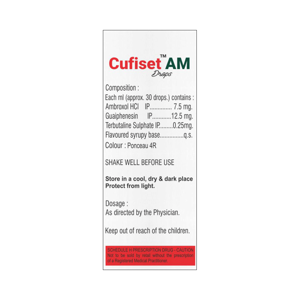 Cufiset AM Oral Drops Strawberry is a medicine used to treat a wet cough (cough with mucus) in children. It helps in thinning the mucus by increasing its water content. This relieves throat irritation and clears congestion, enabling easy breathing for the child. Give Cufiset AM Oral Drops Strawberry to your child orally, with or without food. You may be required to give this medicine to your child for a few days to weeks, depending upon your child’s clinical condition and the severity of the illness. Do not discontinue the medication on your own, even if your child begins to feel better. Continue giving the medicine until the prescribed course is complete. Avoid exceeding the prescribed dose for quicker relief, as it may lead to unwanted effects and worsen your child’s condition. If your child vomits soon after taking Cufiset AM Oral Drops Strawberry, help the child calm down and repeat the same dose.Common side effects of Cufiset AM Oral Drops Strawberry include headache, nausea, and diarrhea. If any of the side effects persist or worsen, consult your child's doctor immediately. Consult your child's doctor before using this medicine for an extended period. Check the medicine label thoroughly, and never combine this medicine with other cold and flu medicines, as that may lead to unwanted interactions unless your doctor suggests it.Narrate your child’s complete medical history to the doctor, including any previous episode of respiratory illness, allergy, heart problems, blood disorders, birth defects, airway obstruction, lung anomaly, sinus issues, liver impairment, and kidney malfunction. This information is critical for dose alterations and for planning your child's overall treatment.