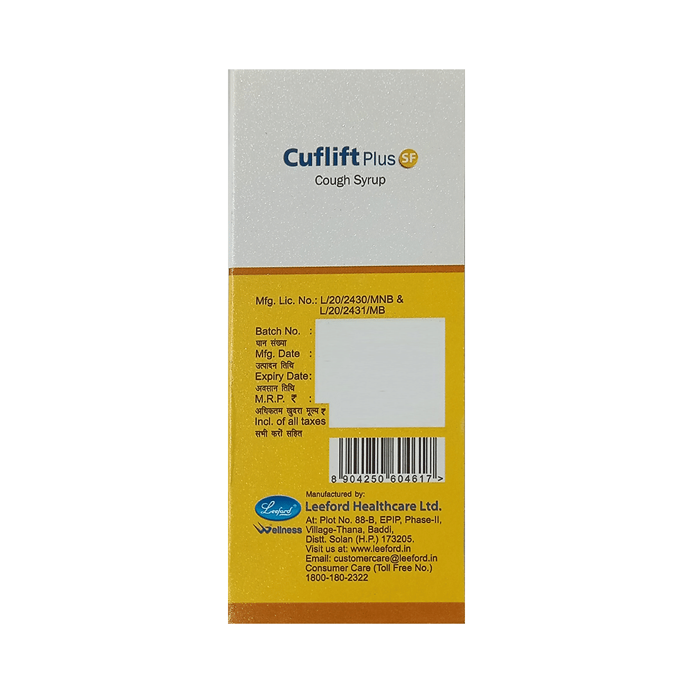 In CoughCuflift Plus SF Syrup gives relief from cough by loosening thick mucus and making it easier to cough it out. It also makes it easier for air to move in and out of your airways. This reduces the frequency of coughing and makes you feel better. Cuflift Plus SF Syrup also soothes your throat and gives relief from irritation. Along with medications, drink enough luke warm water and gargle with warm salt water to ease the symptoms.