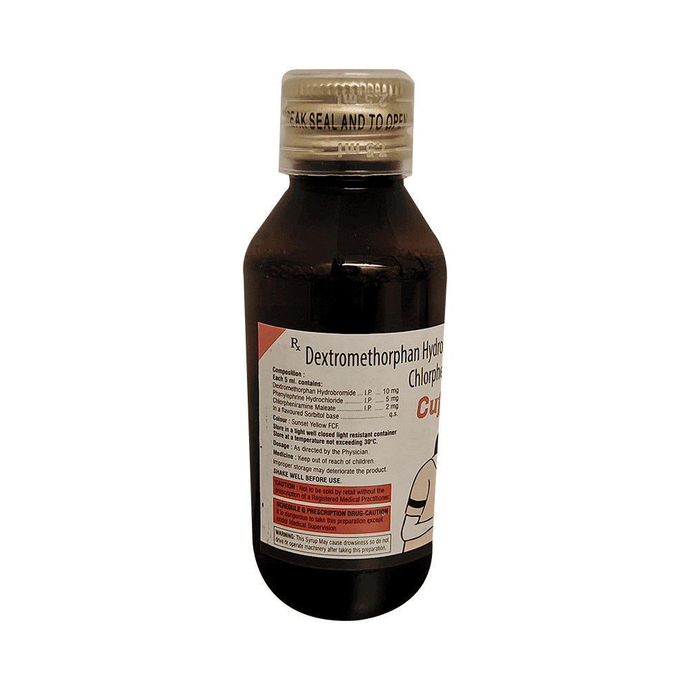 Cufmeric-DX Cough Syrup Orange is a combination medicine used in the treatment of dry cough. It relieves allergy symptoms such as runny nose, stuffy nose, sneezing, watery eyes and congestion or stuffiness. Cufmeric-DX Cough Syrup Orange is taken with or without food in a dose and duration as advised by the doctor. The dose you are given will depend on your condition and how you respond to the medicine. You should keep taking this medicine for as long as your doctor recommends. If you stop treatment too early your symptoms may come back and your condition may worsen. Let your healthcare team know about all other medications you are taking as some may affect, or be affected by this medicine.The most common side effects are nausea, upset stomach, insomnia, palpitations, and high blood pressure. Most of these are temporary and usually resolve with time. Contact your doctor straight away if you are at all concerned about any of these side effects. This medicine can also cause dizziness and sleepiness, so do not drive or do anything that requires mental focus until you know how this medicine affects you. Avoid drinking alcohol while taking this medicine as it can worsen your sleepiness.Never support self-medication or recommend your medicine to another person. Keep it out of reach of children. It is beneficial to have plenty of fluids while taking this medication. Before taking it, you should tell your doctor if you have any liver diseases so that your doctor can prescribe a suitable dose for you. Pregnant or breastfeeding women should consult their doctor before taking this medicine.