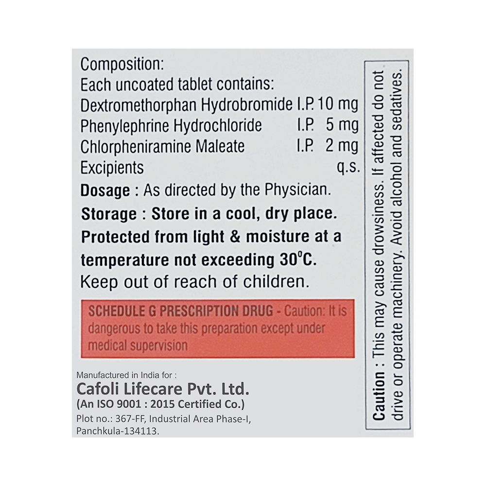 Salt Composition: Phenylephrine (5mg) + Chlorpheniramine Maleate (2mg) + Dextromethorphan Hydrobromide (10mg)