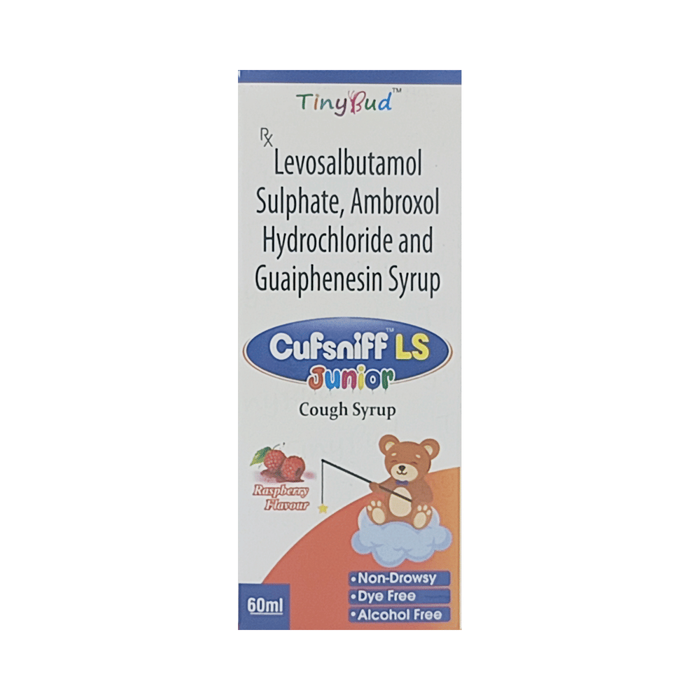 Cufsniff LS Junior Syrup Raspberry is a combination medicine used in the treatment of cough with mucus. It thins mucus in the nose, windpipe, and lungs, making it easier to cough out. It also provides relief from runny nose, sneezing, itching, and watery eyes. Cufsniff LS Junior Syrup Raspberry is taken with or without food in a dose and duration as advised by the doctor. The dose you are given will depend on your condition and how you respond to the medicine. You should keep taking this medicine for as long as your doctor recommends. If you stop treatment too early your symptoms may come back and your condition may worsen. Let your healthcare team know about all other medications you are taking as some may affect, or be affected by this medicine.The most common side effects are nausea, diarrhea, stomach pain, vomiting, muscle cramp, headache, skin rash, and increased heart rate. Most of these are temporary and usually resolve with time. Contact your doctor straight away if you are at all concerned about any of these side effects. This medicine can also cause sleepiness, so do not drive or do anything that requires mental focus until you know how this medicine affects you. Avoid drinking alcohol while taking this medicine as it can make sleepiness worse.Never support self-medication or recommend your medicine to another person. It is beneficial to have plenty of fluids while taking this medication. Before taking this medicine, you should tell your doctor if you are pregnant, planning pregnancy, or breastfeeding. You should also tell your doctor if you have any kidney or liver diseases so that your doctor can prescribe a suitable dose for you.